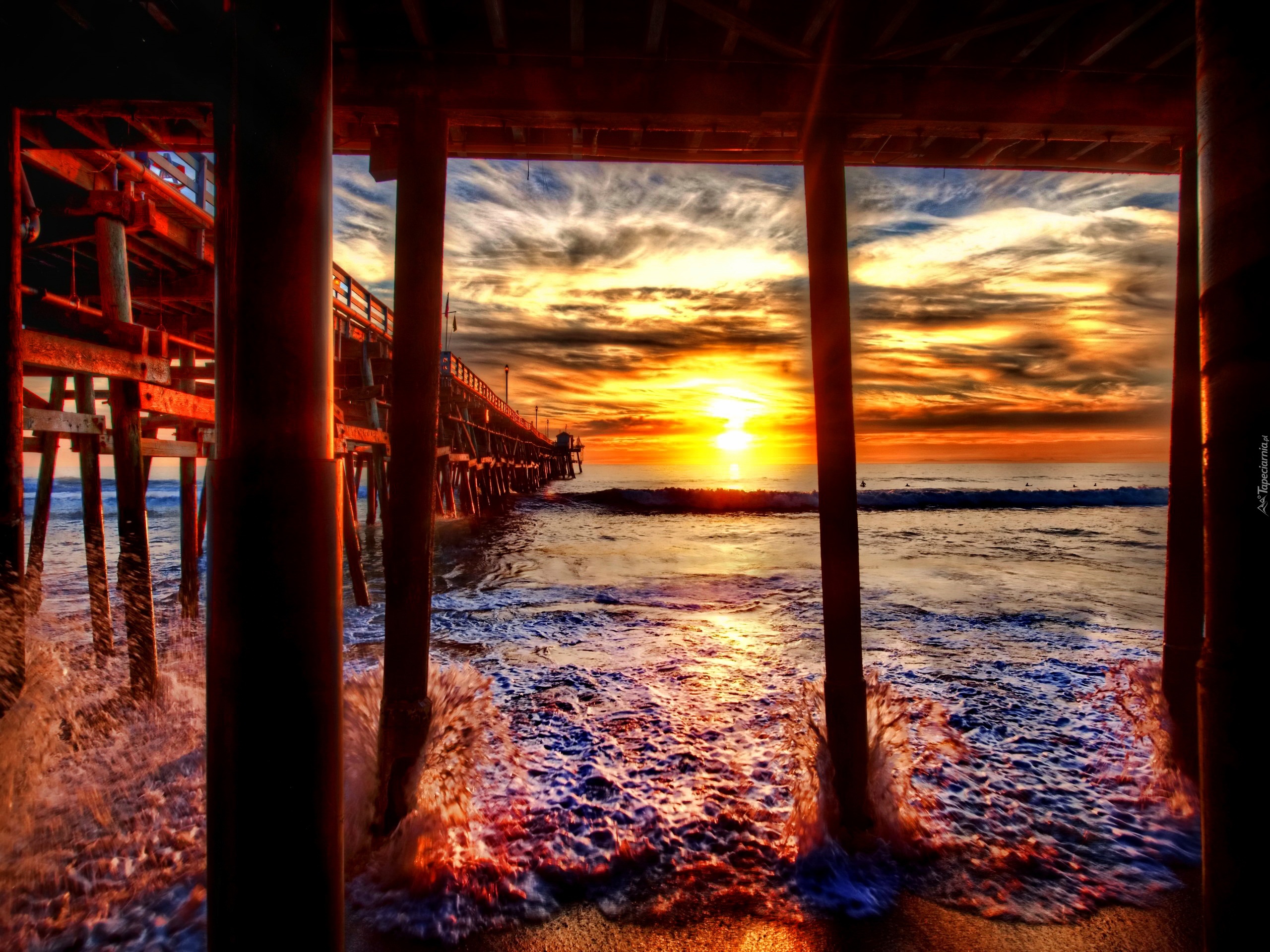Edytor tapety: Zachód, Słońca, Morze, Molo, Pale