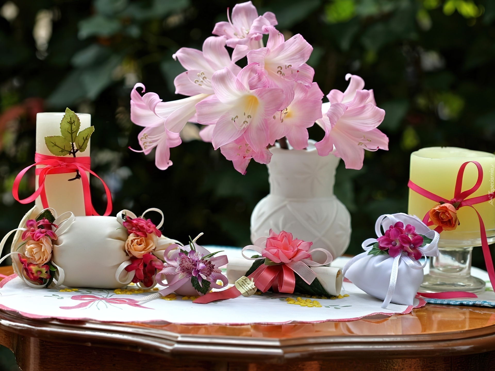 Edytor tapety: Różowe, Lilie, Wazon, Prezenty