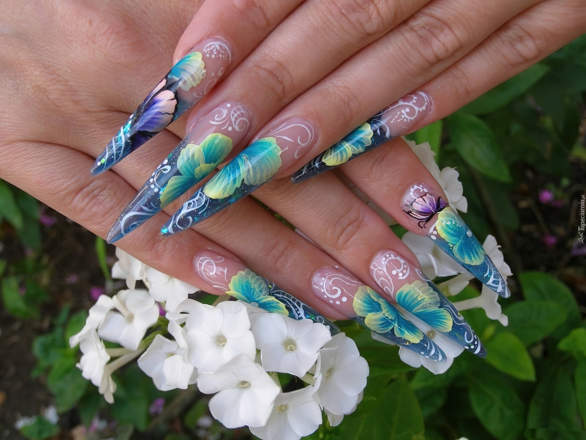 Edytor tapety: Kobiece, Dłonie, Kolorowe, Paznokcie, Kwiaty