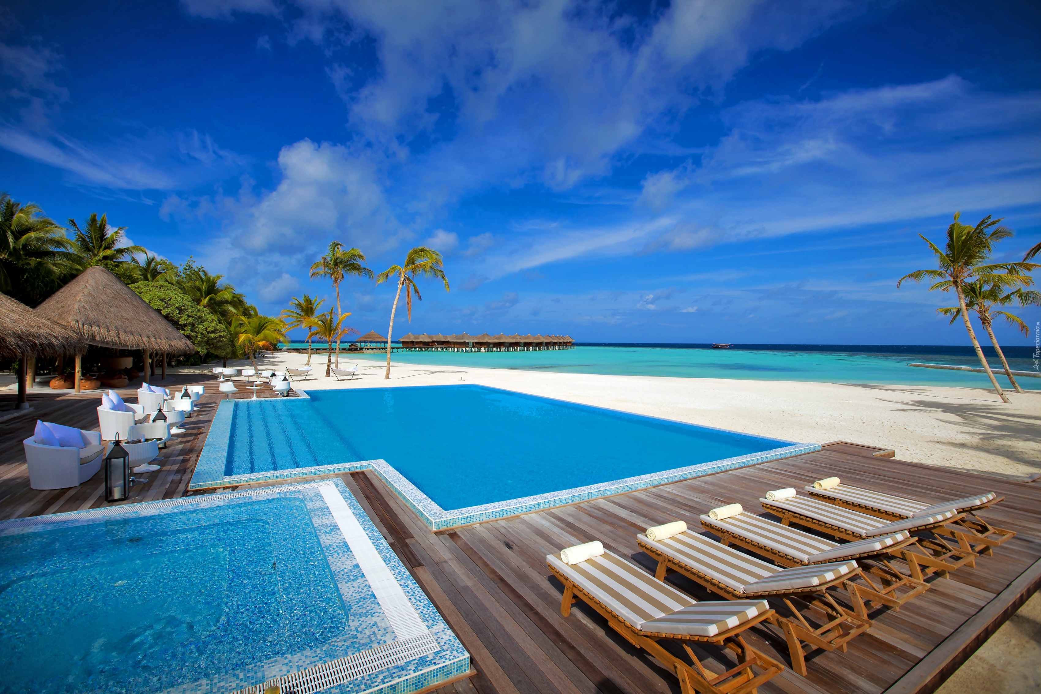 Edytor tapety: Basen, Morze, Leżaki, Domki, Palmy, Wakacje