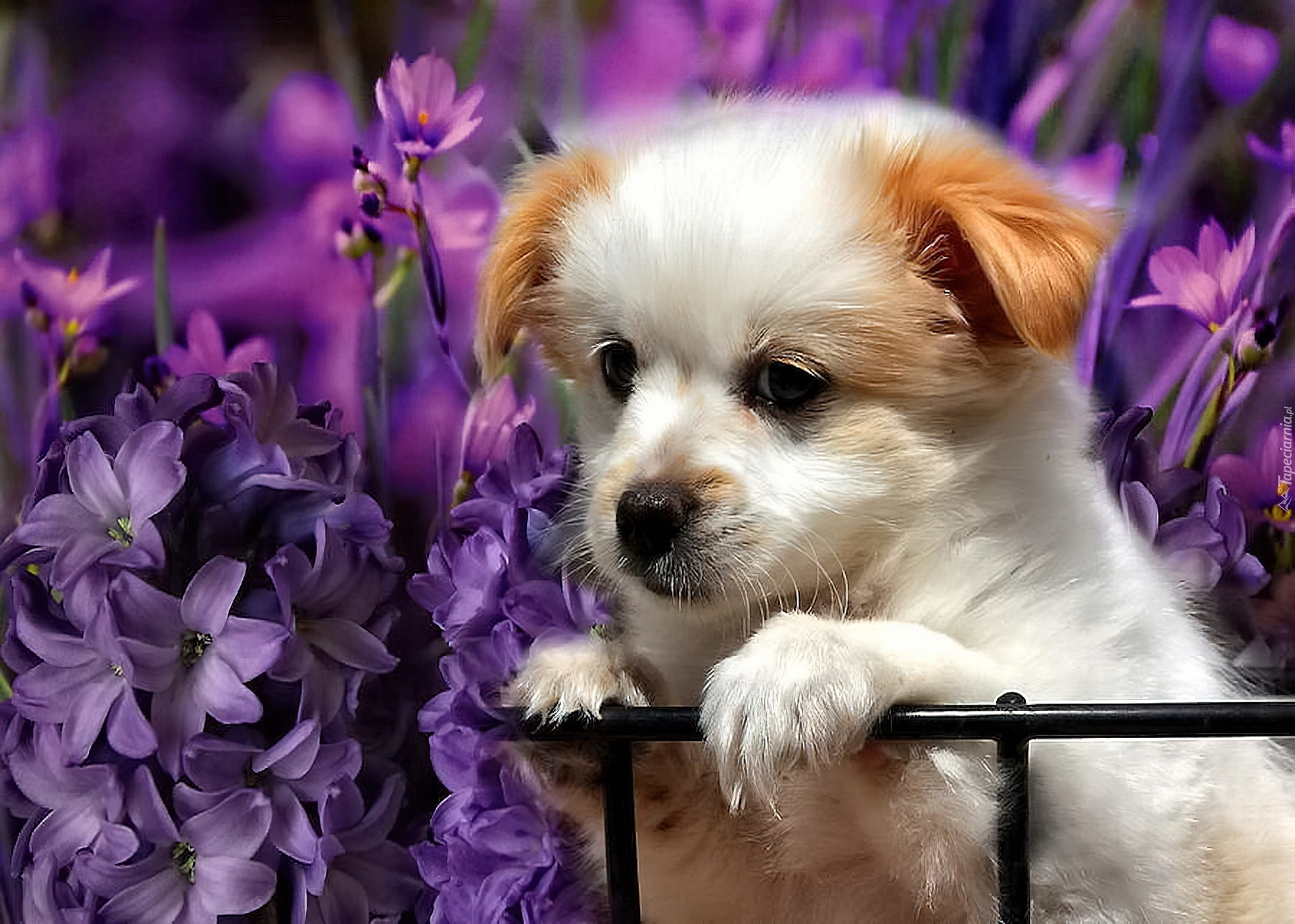 Edytor tapety: Słodki, Szczeniaczek, Fioletowe, Kwiaty