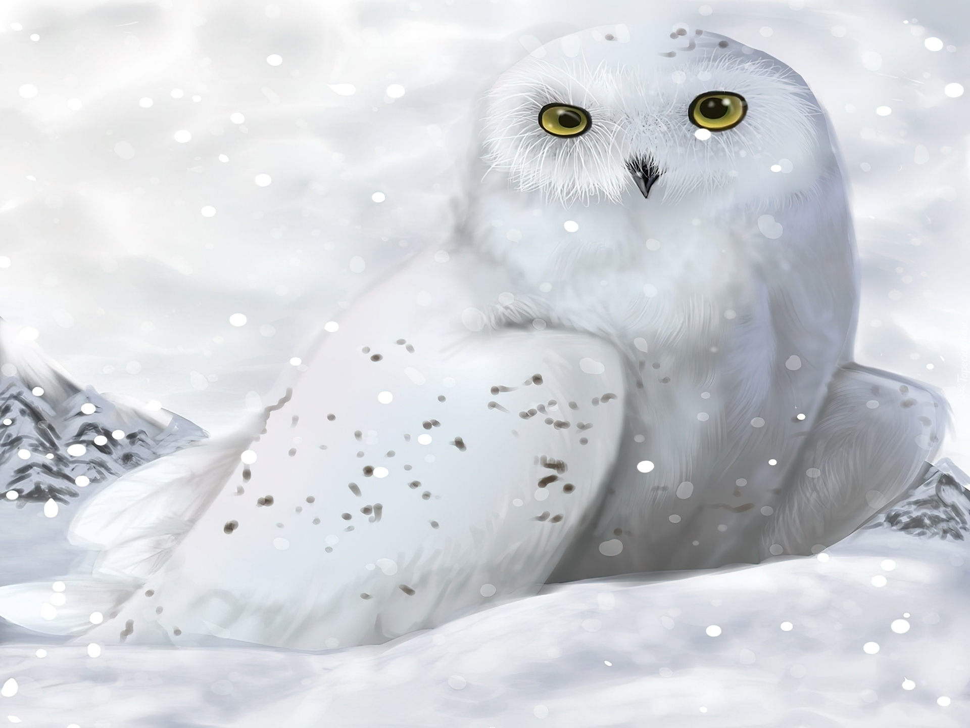 Edytor tapety: Biała, Sowa śnieżna, Śnieg, Grafika