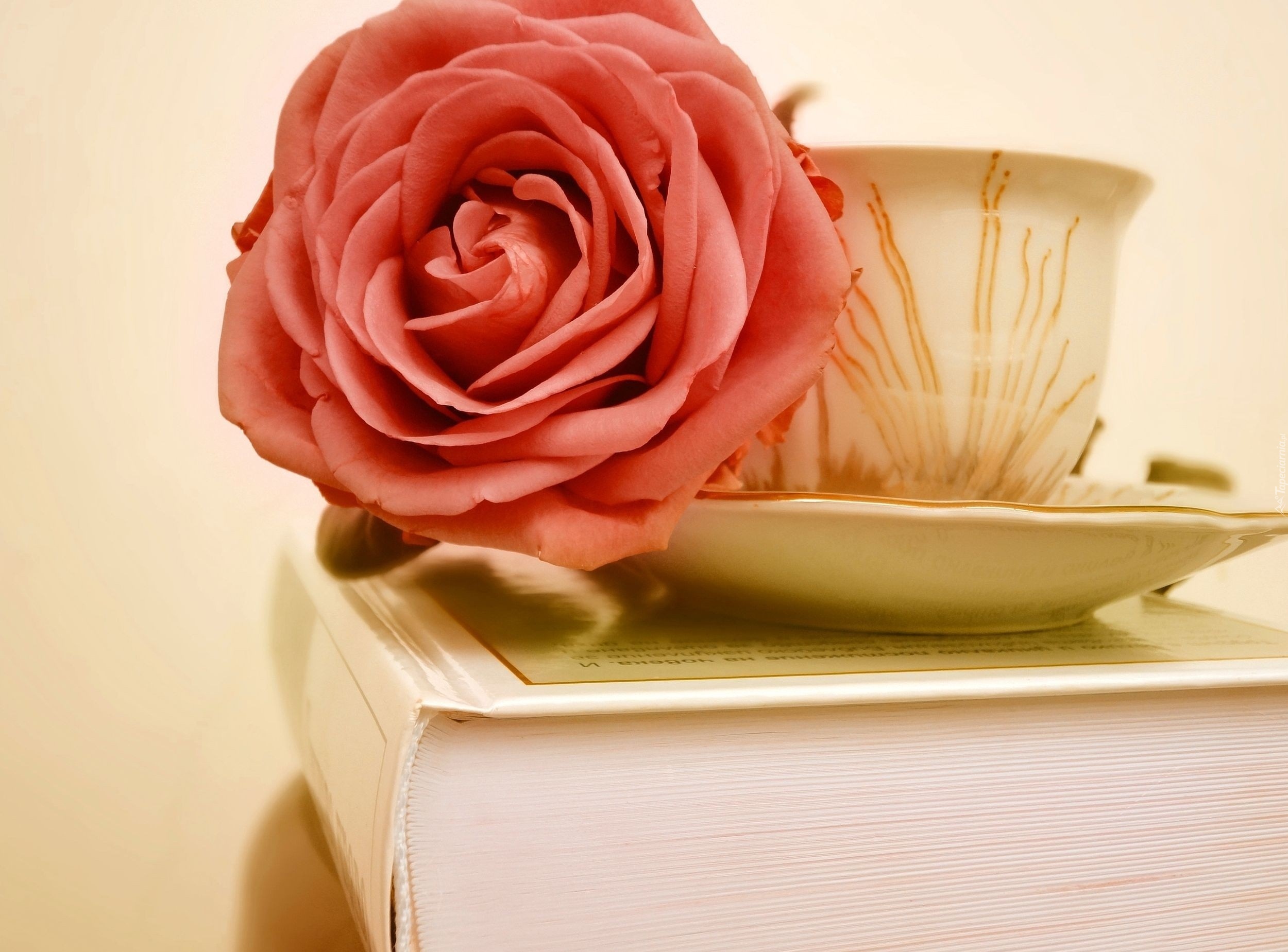 Edytor tapety: Różowa, Róża, Filiżanka, Książka