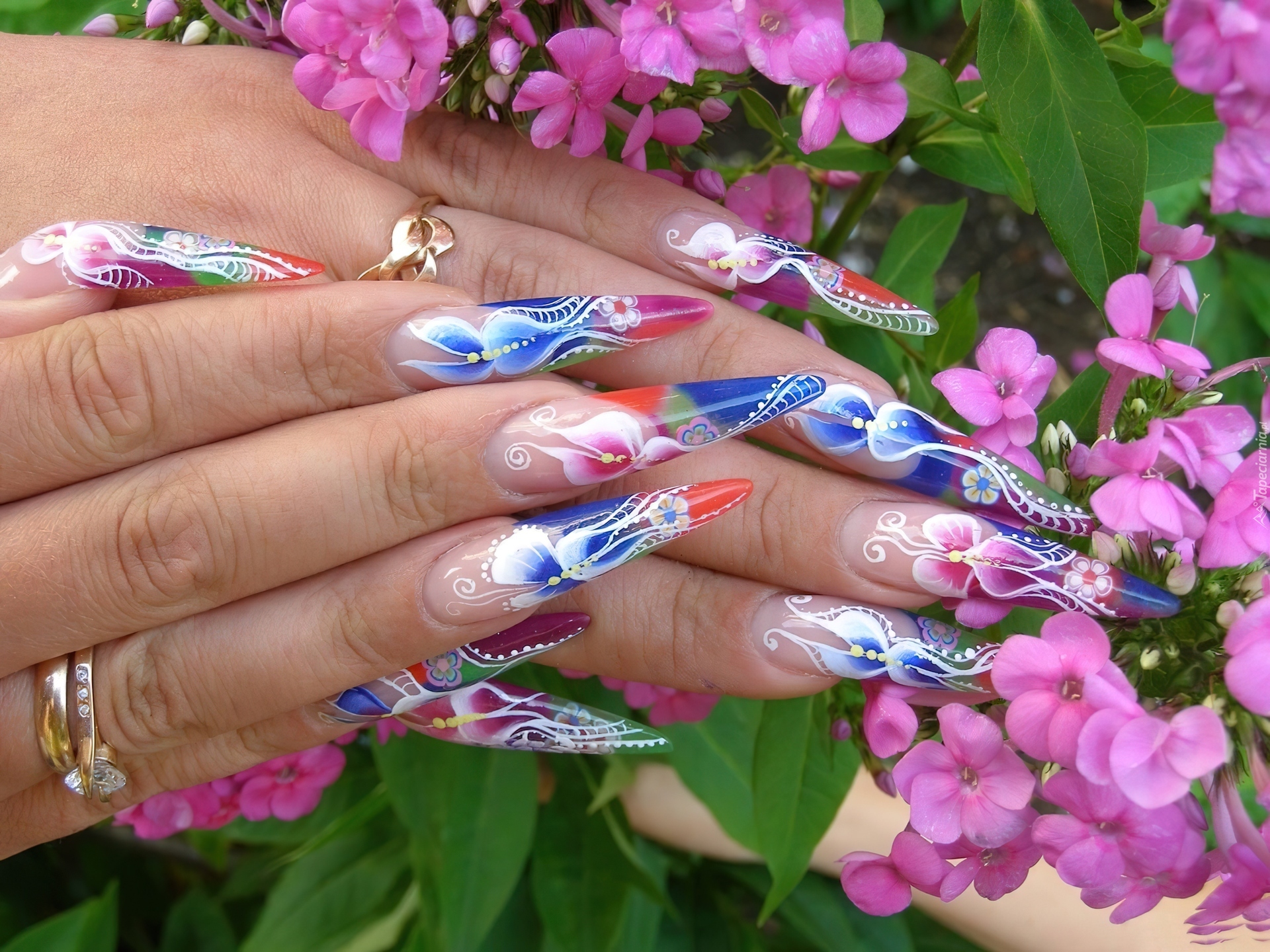 Edytor tapety: Damskie, Dłonie, Kolorowe, Długie, Paznokcie, Kwiaty