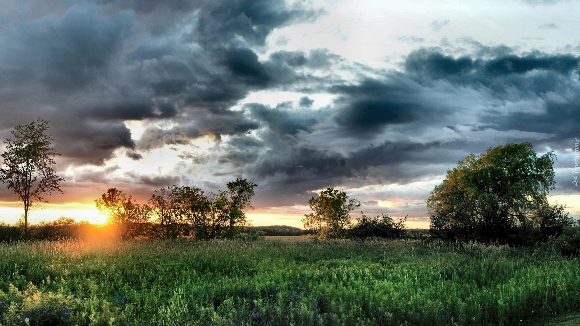 Edytor tapety: Zachód, Słońca, Łąka, Chmury