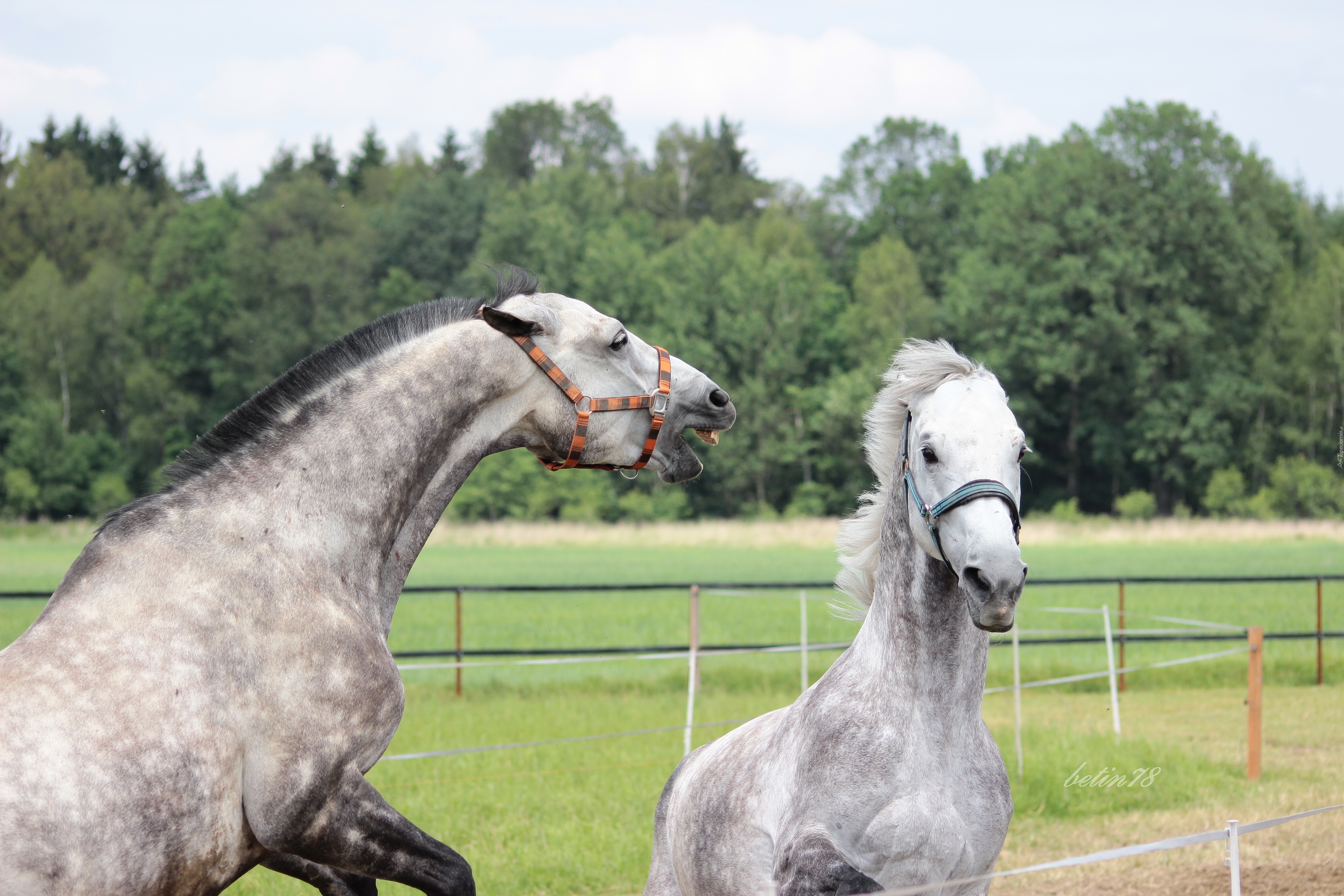 Edytor tapety: Konie, Siwe, Walka, Atak, Pastwisko