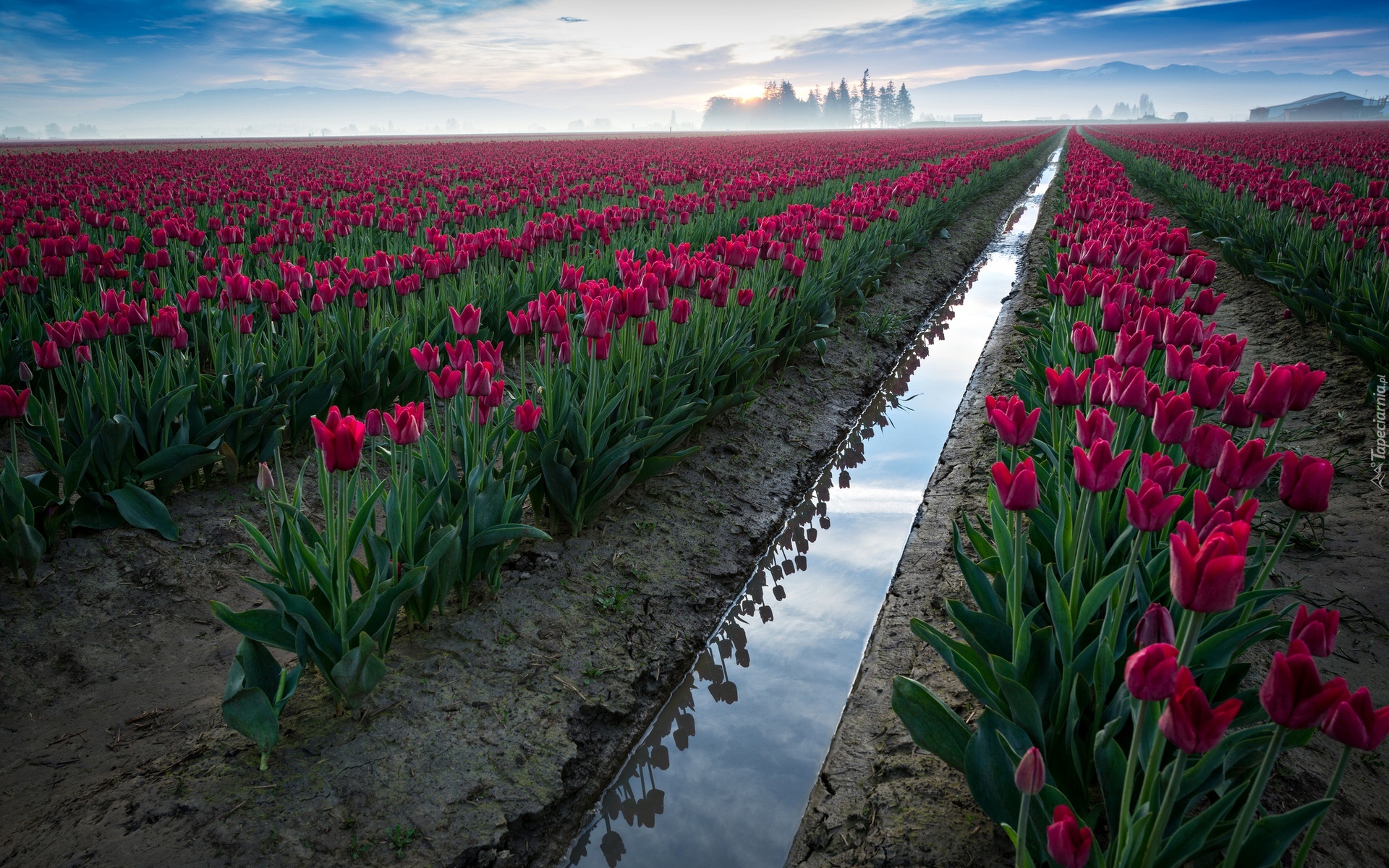 Edytor tapety: Czerwone, Tulipany, Pole, Uprawa