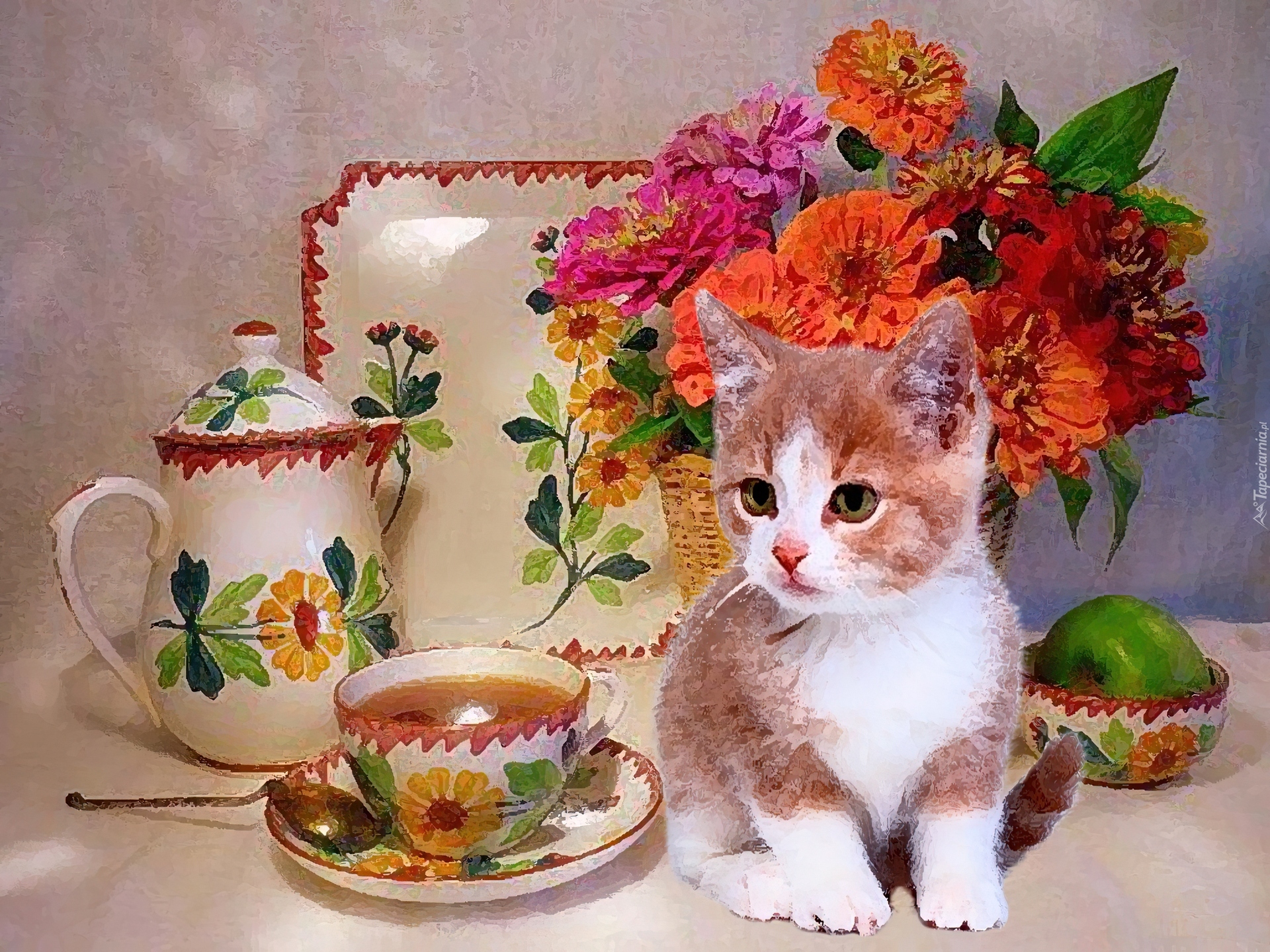 Edytor tapety: Mały, Kotek, Filiżanka, Kwiaty, Obraz