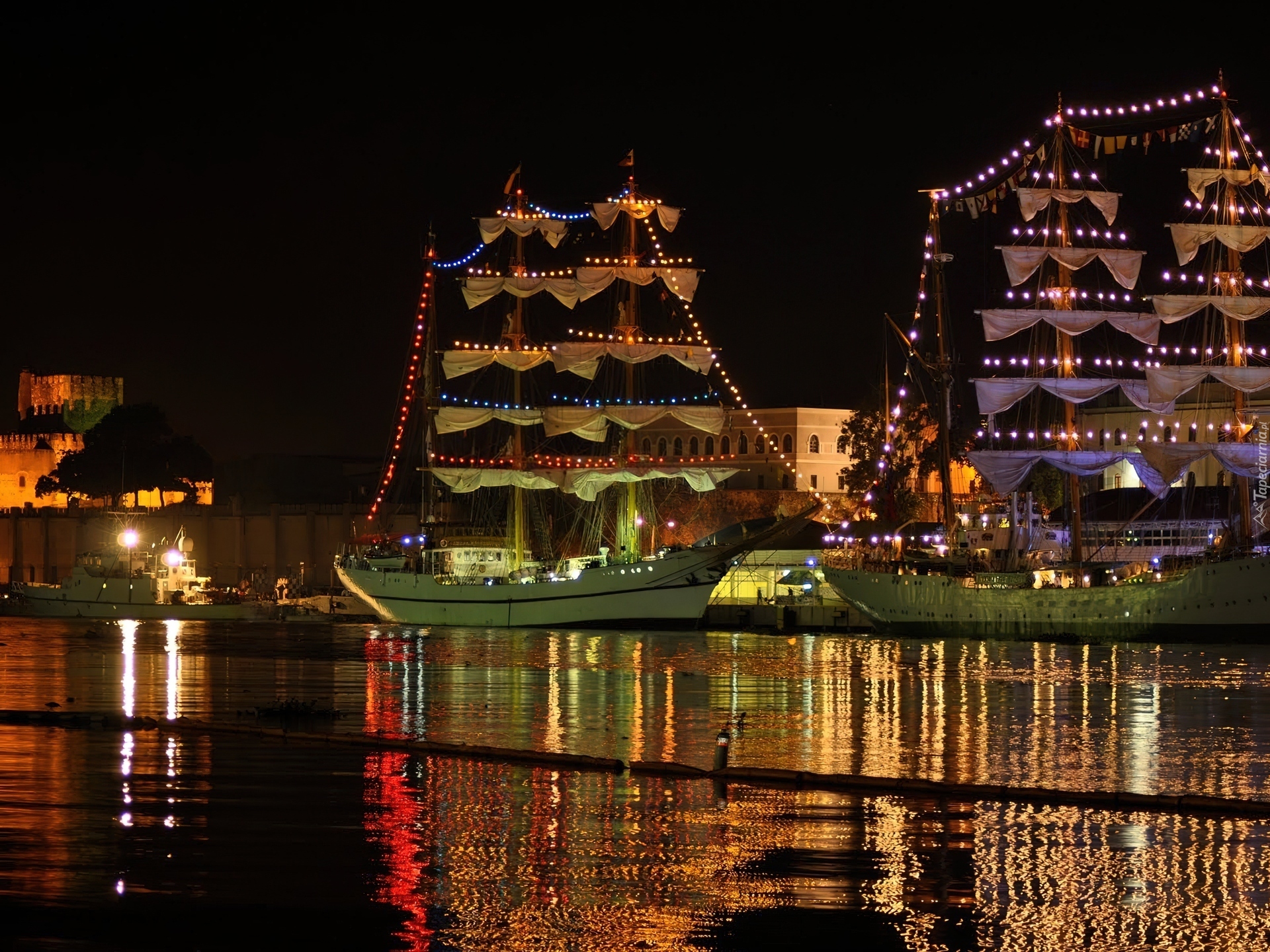 Edytor tapety: Port, Oświetlone, Żaglowce