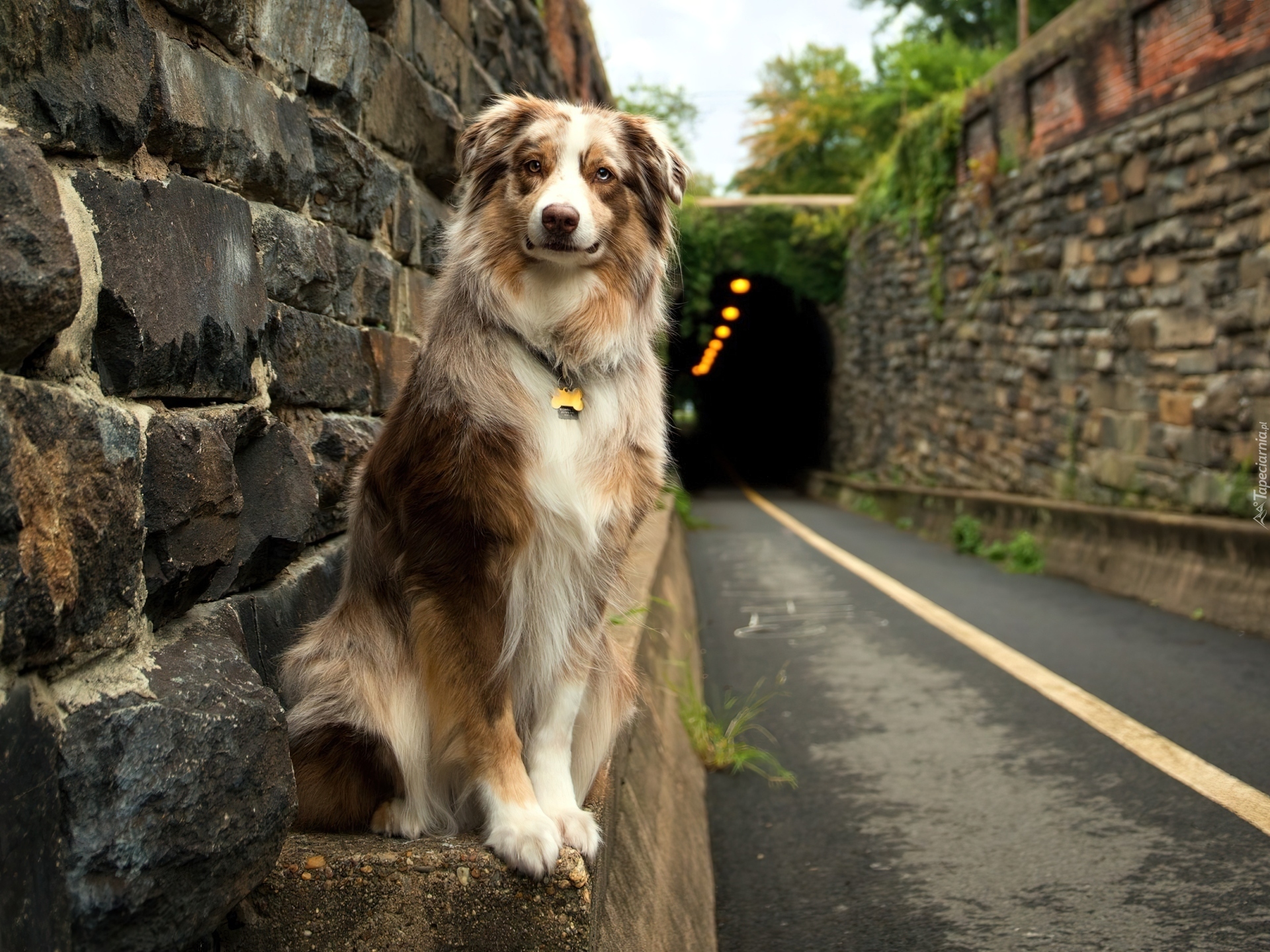 Edytor tapety: Owczarek australijski, Australian shepherd, Droga, Tunel