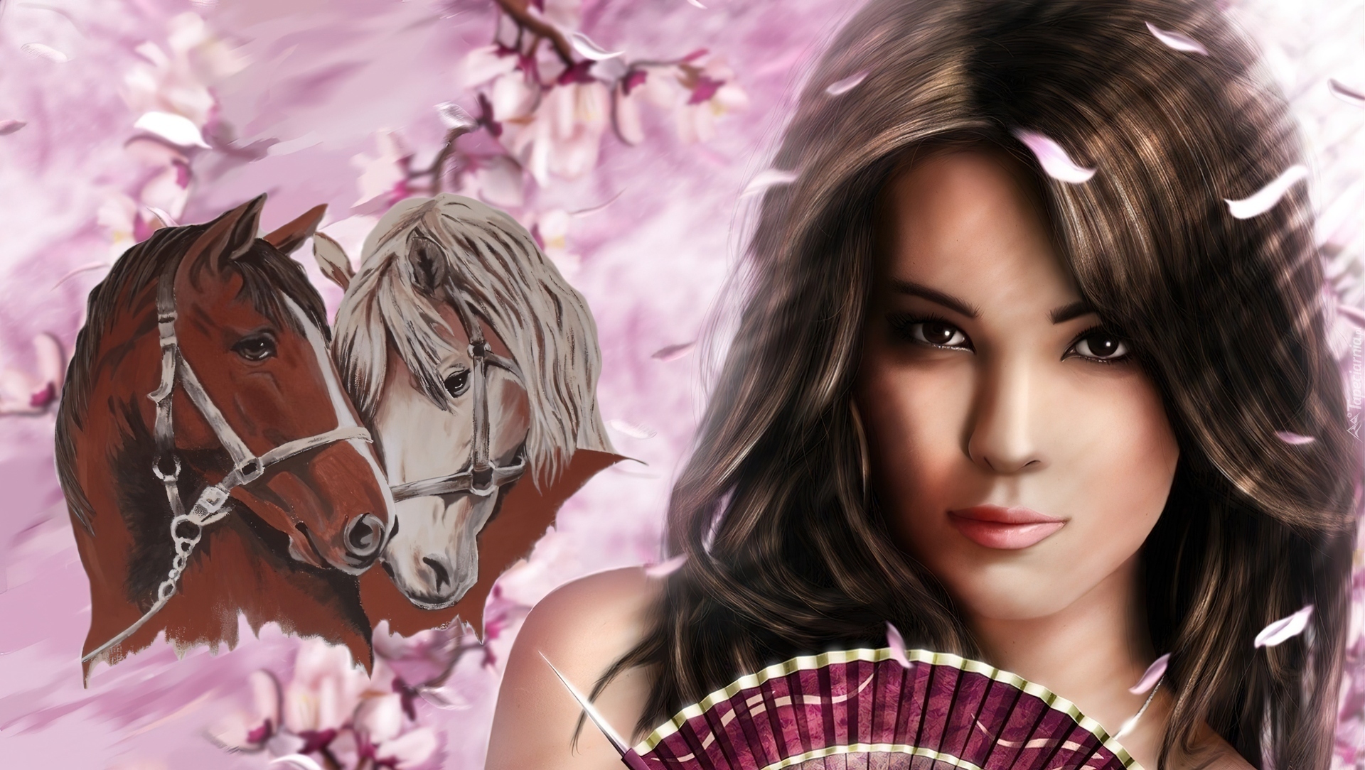 Edytor tapety: Dziewczyna, Konie, Kwiaty