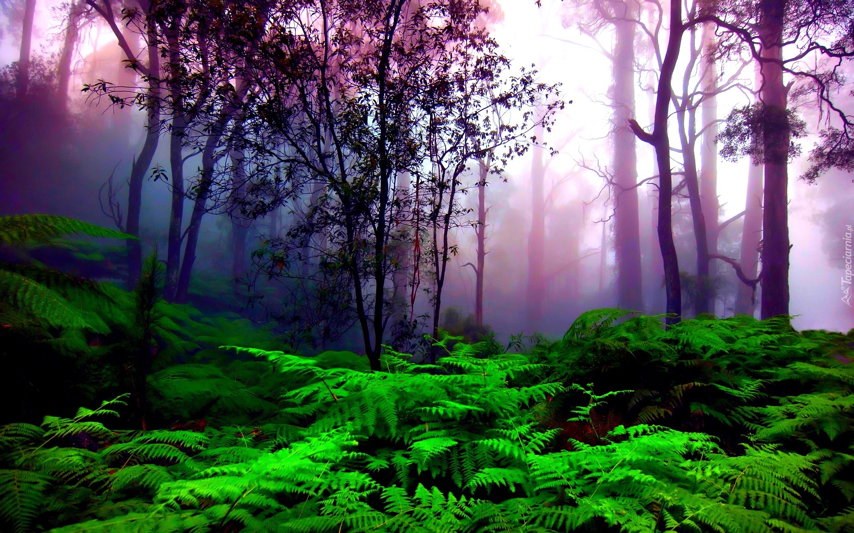 Edytor tapety: Las, Paproć, Fioletowa, Mgła