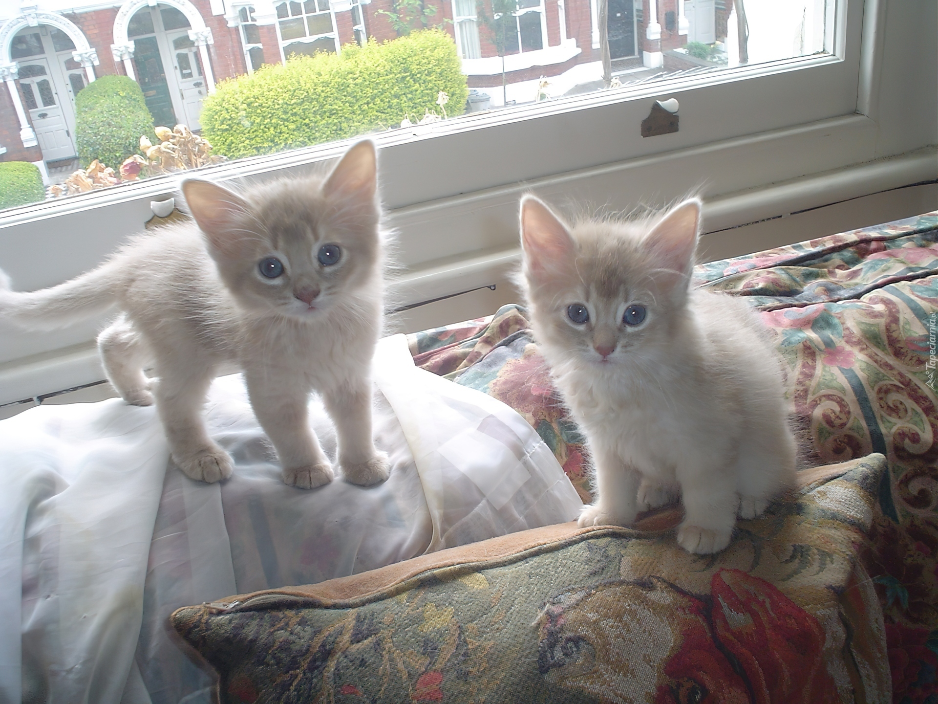 Edytor tapety: Dwa, Białe, Kotki, Poduszki, Okno