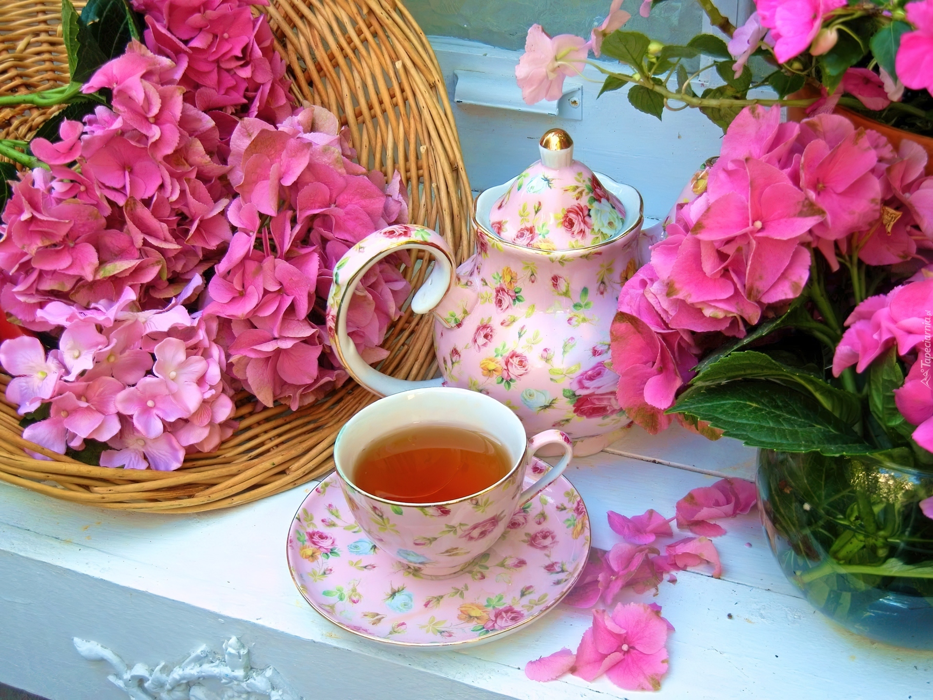 Edytor tapety: Filiżanka, Herbaty, Dzbanek, Różowa, Hortensja