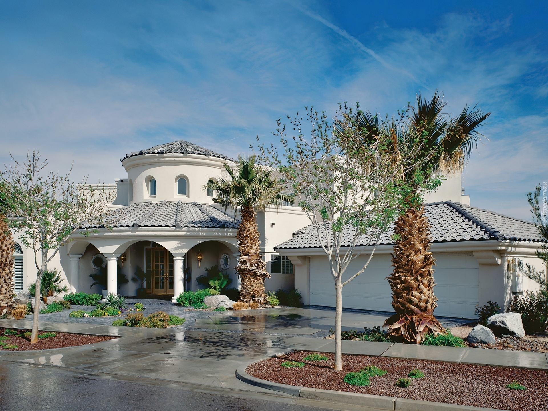 Edytor tapety: Biała, Willa, Wjazd, Palmy