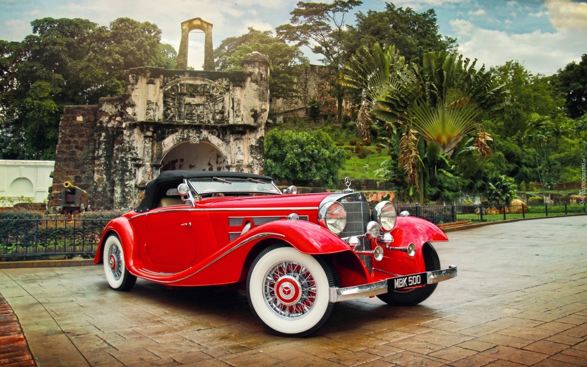 Edytor tapety: Mercedes, Czerwony, Parking, Drzewa