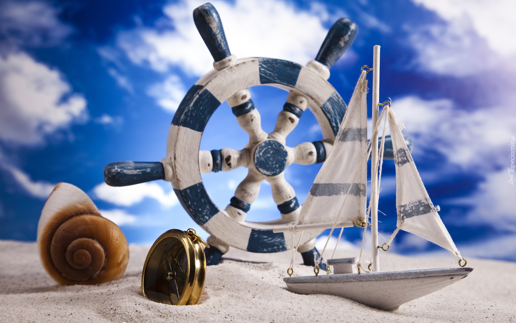 Edytor tapety: Niebo, Plaża, Muszelka, Stateczek, Zegarek