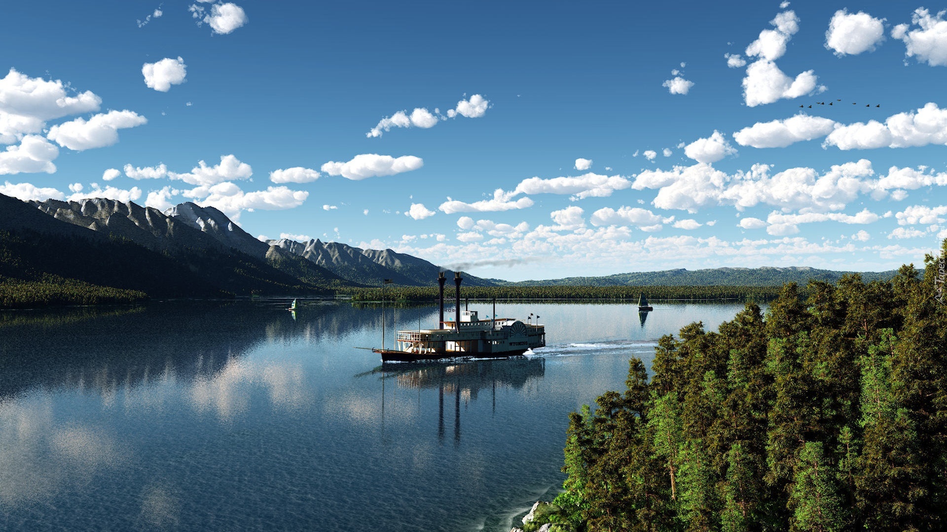 Edytor tapety: Jezioro, Parostatek, Żaglówki, Drzewa, Góry, Niebo