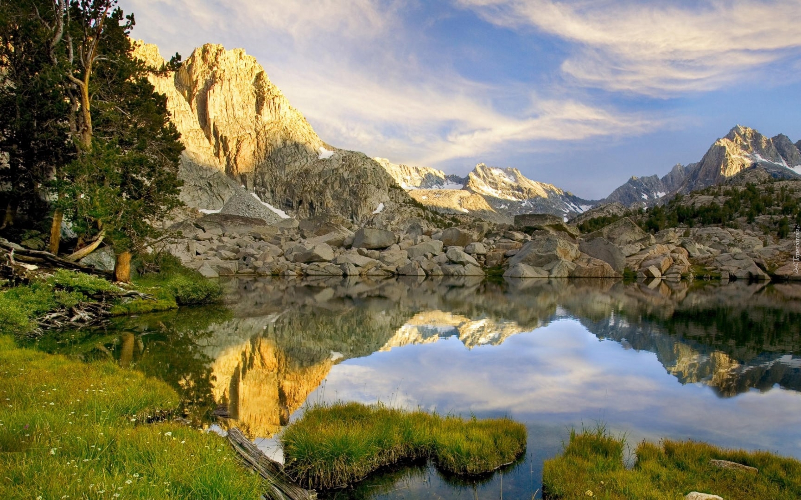 Edytor tapety: Jezioro, Góry, Skały, Trawa, Drzewa
