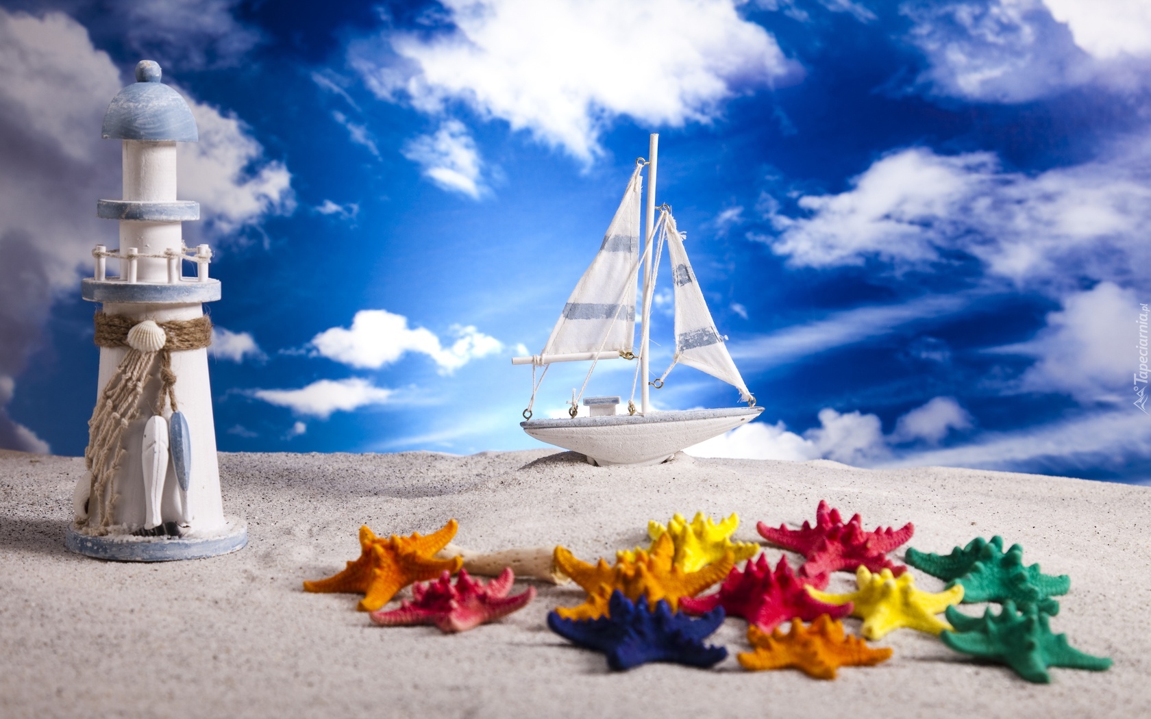 Edytor tapety: Niebo, Stateczek, Plaża, Latarnia, Morska, Rozgwiazdy
