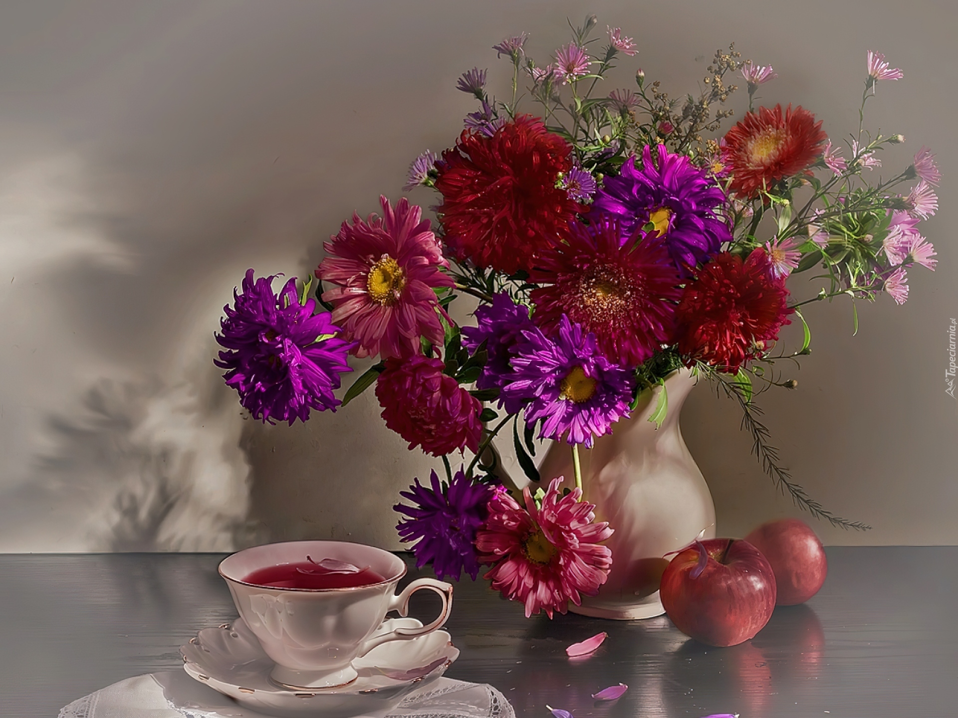 Edytor tapety: Bukiet, Astrów, Jabłka, Filiżanka, Herbaty