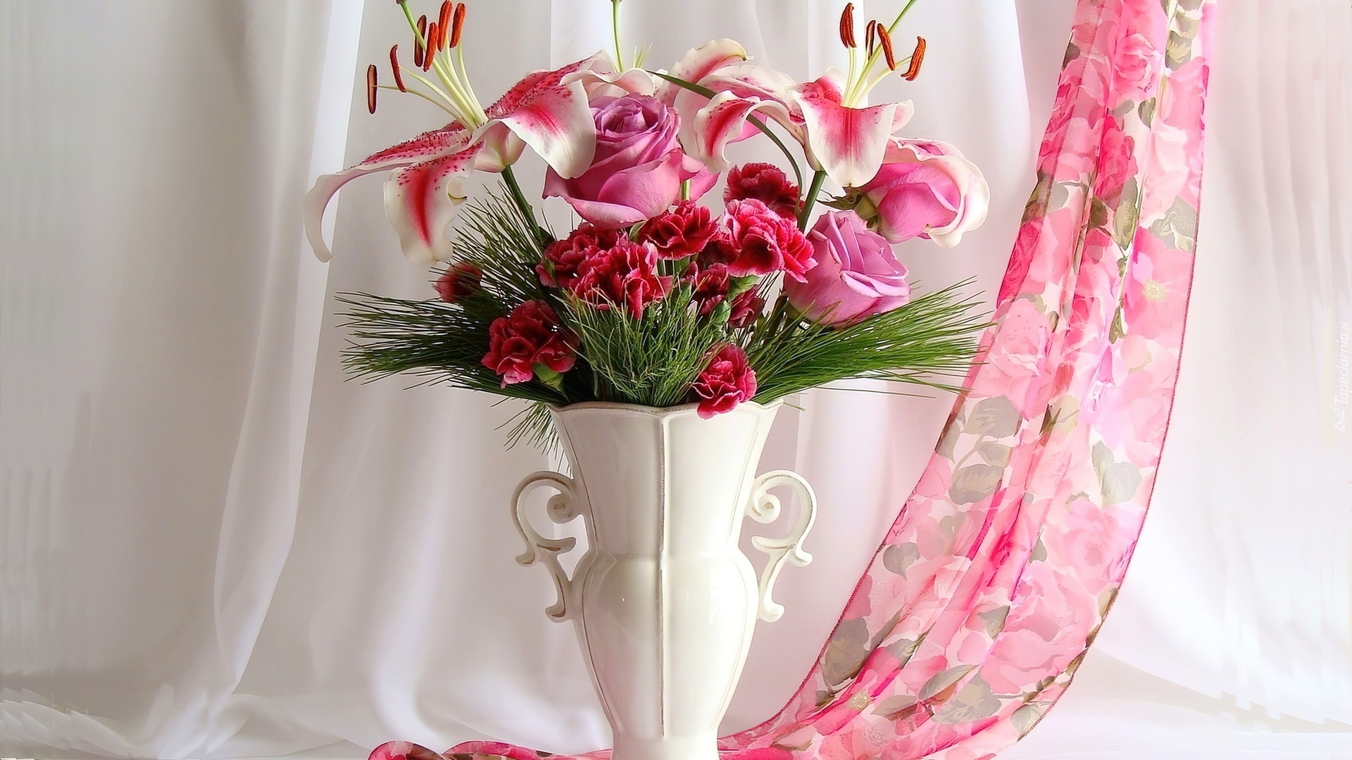 Edytor tapety: Biały, Wazon, Bukiet, Kwiatów, Kolorowy, Szal