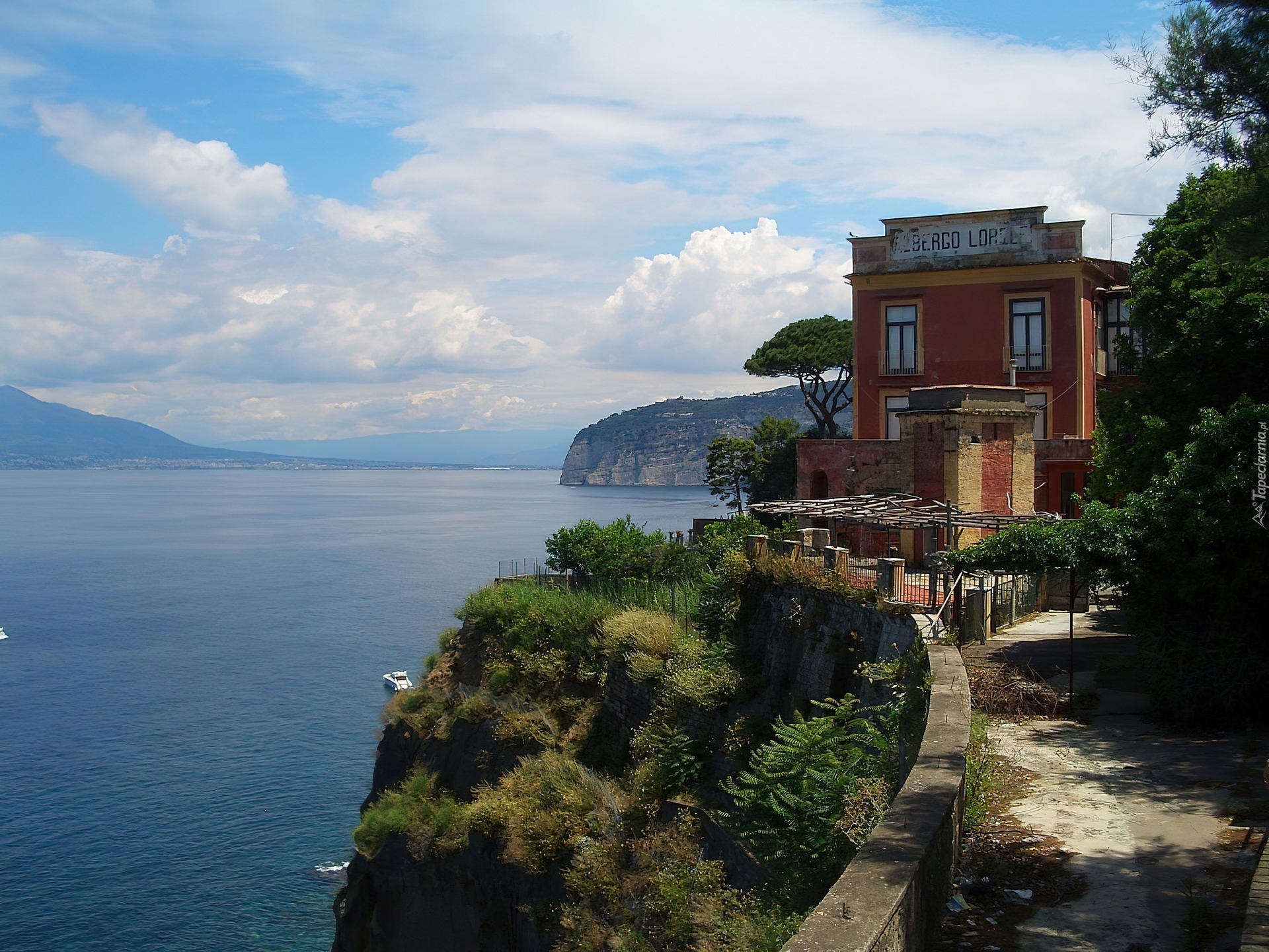Edytor tapety: Sorrento, Włochy, Woda, Dom, Murek, Drzewa, Krzaki