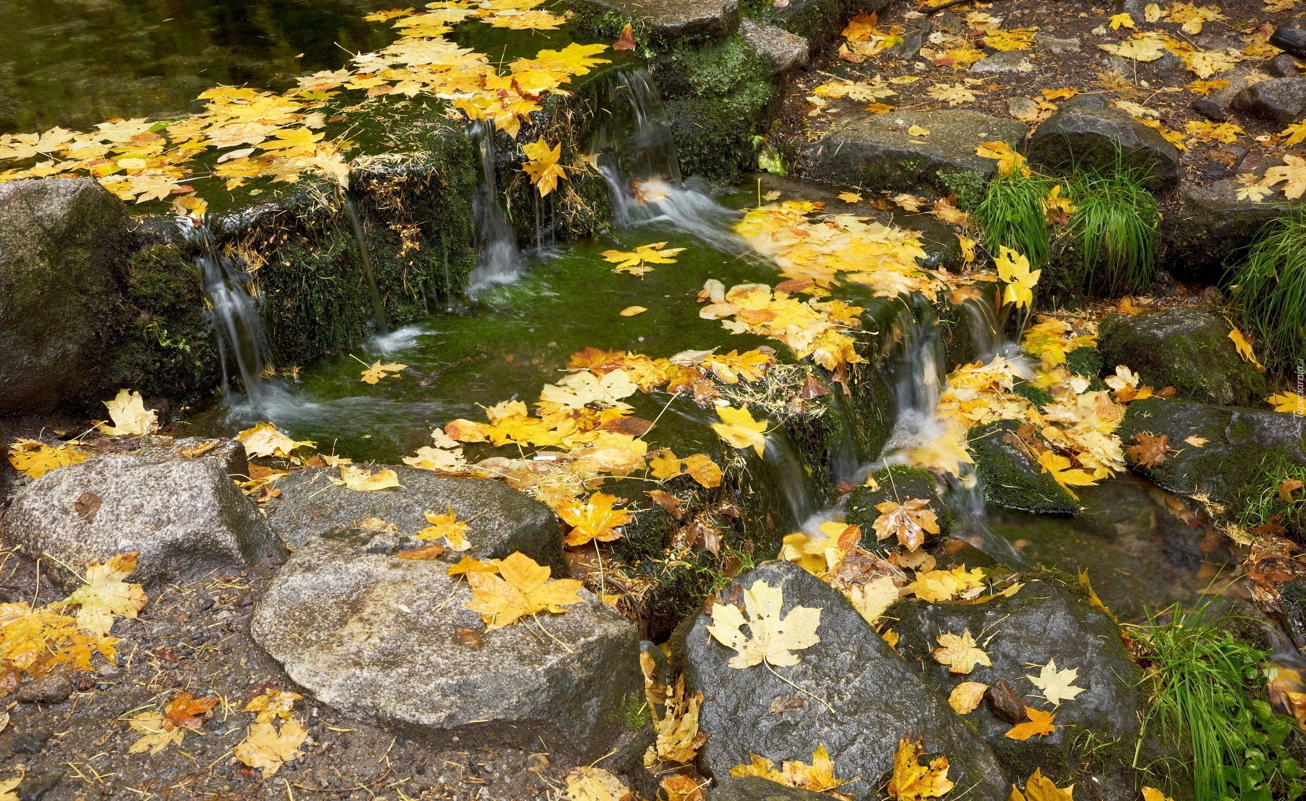 Edytor tapety: Jesień, Kaskada, Liście, Kamienie