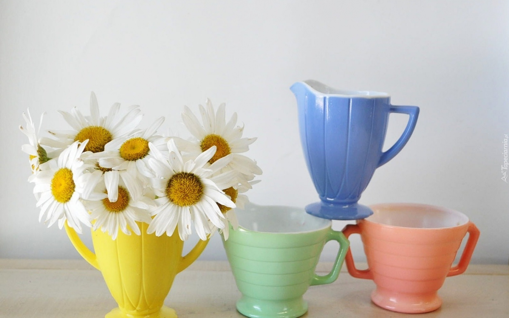 Edytor tapety: Białe, Margerytki, Kolorowe, Filiżanki