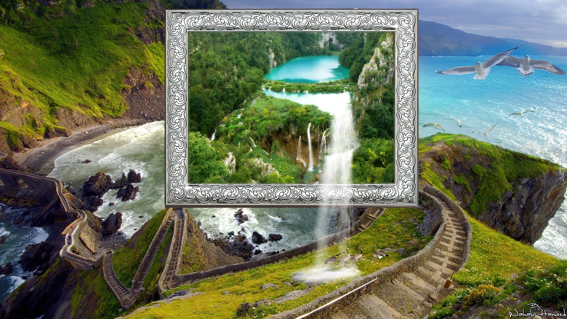 Edytor tapety: Góry, Wodospad, Jezioro, Obraz, Art