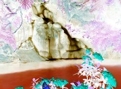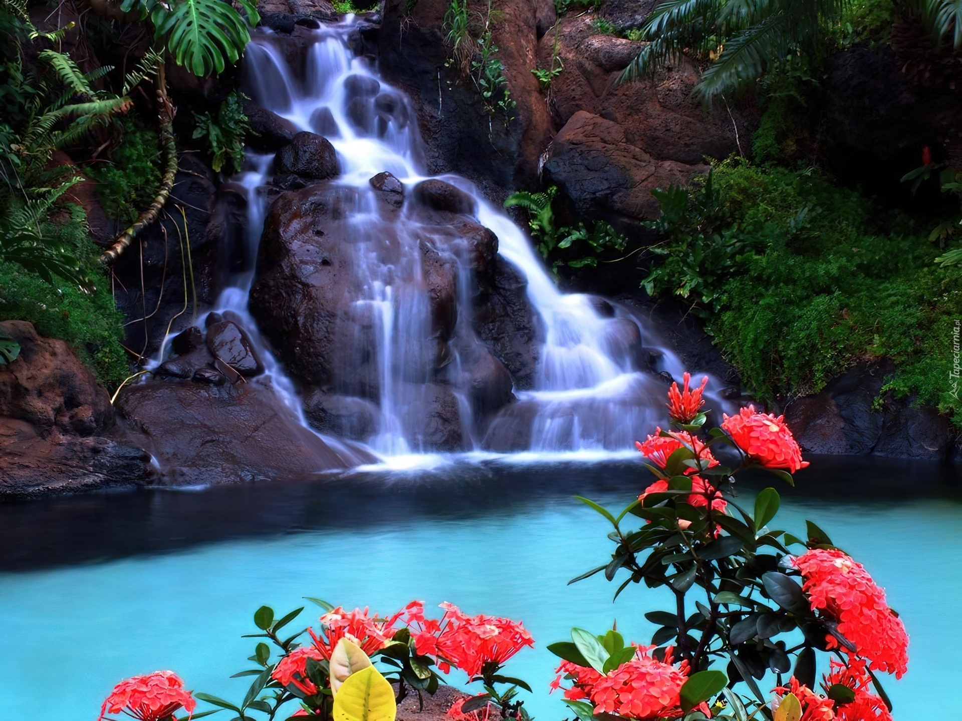 Edytor tapety: Wodospad, Woda, Kwiaty, Drzewa