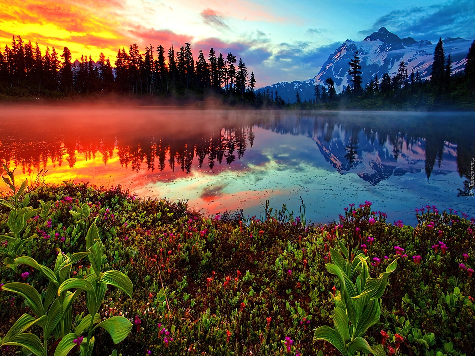 Edytor tapety: Zachód, Słońca, Jezioro, Rośliny