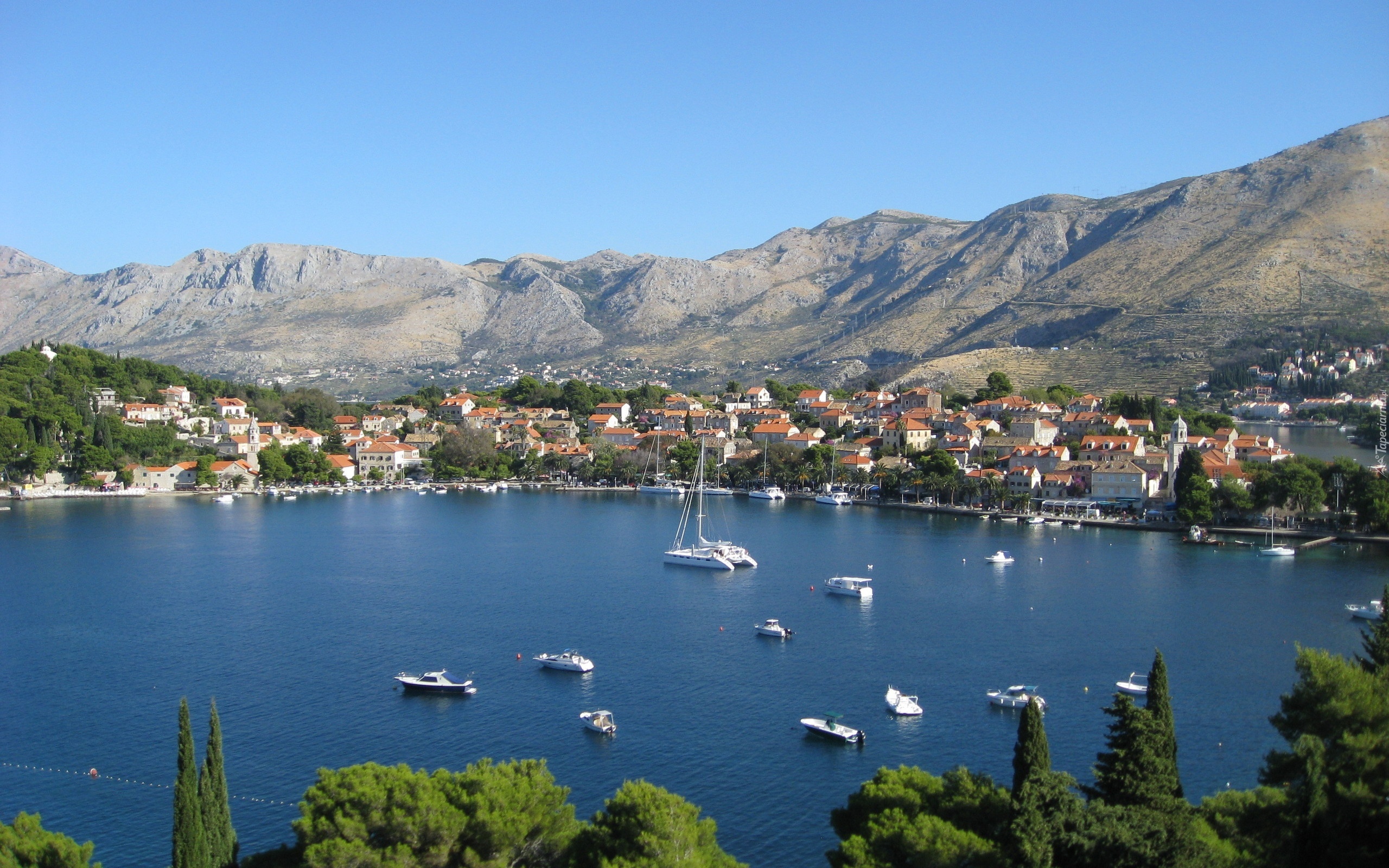 Edytor tapety: Jezioro, Motorówki, Katamaran, Góry, Domy