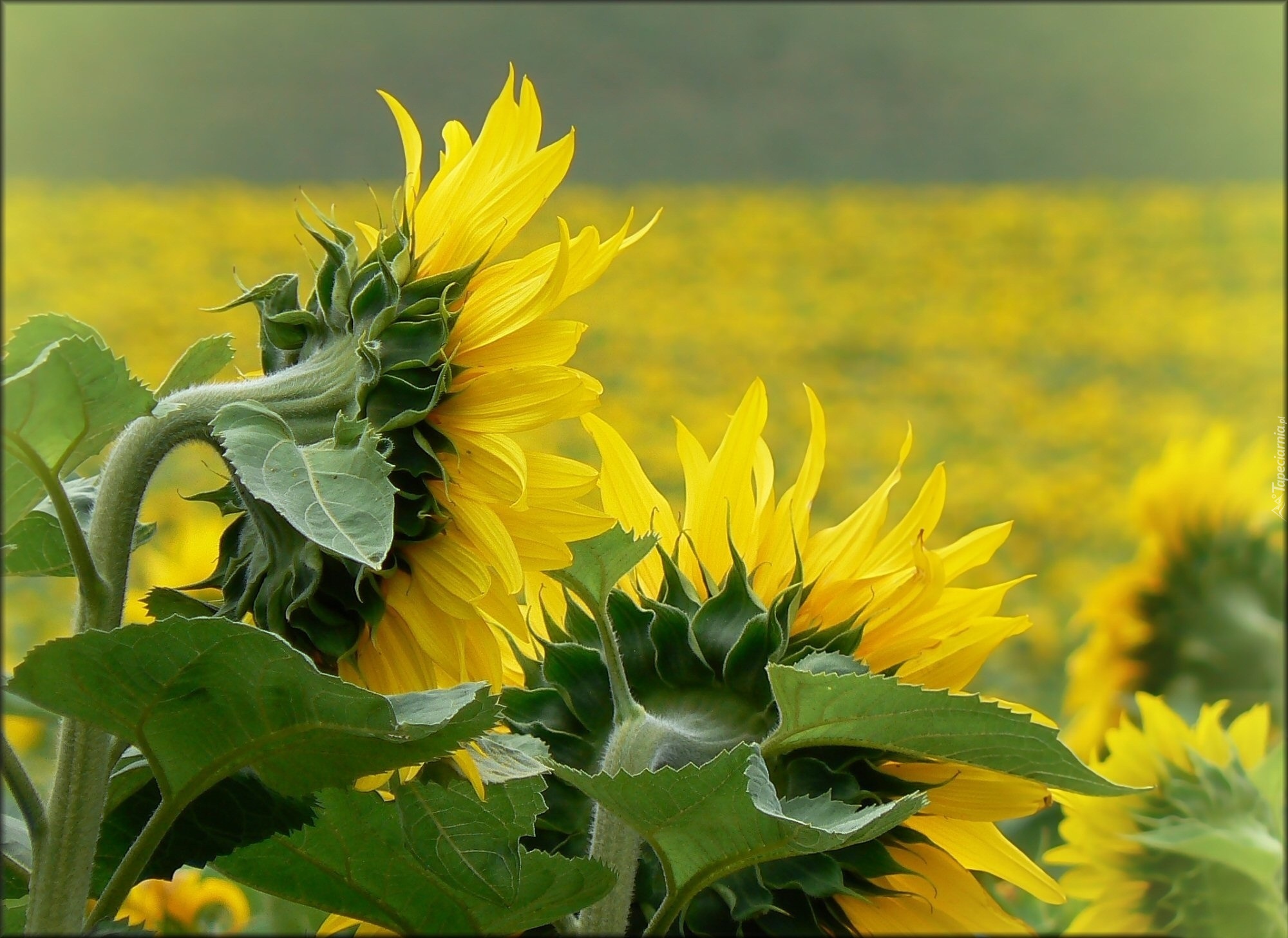 Edytor tapety: Słoneczniki, Pole, Zielone, Liście