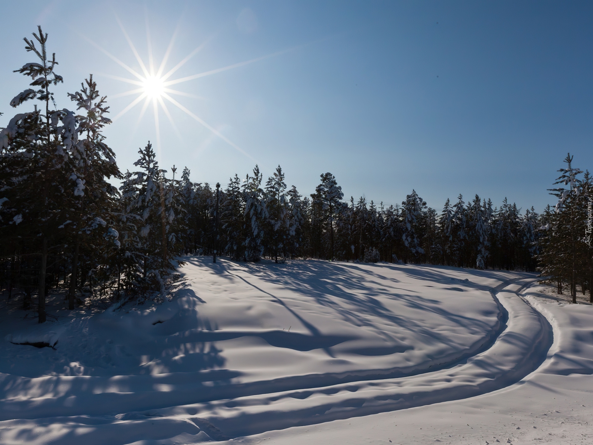 Edytor tapety: Las, Śnieg, Koleiny, Promienie, Słońca