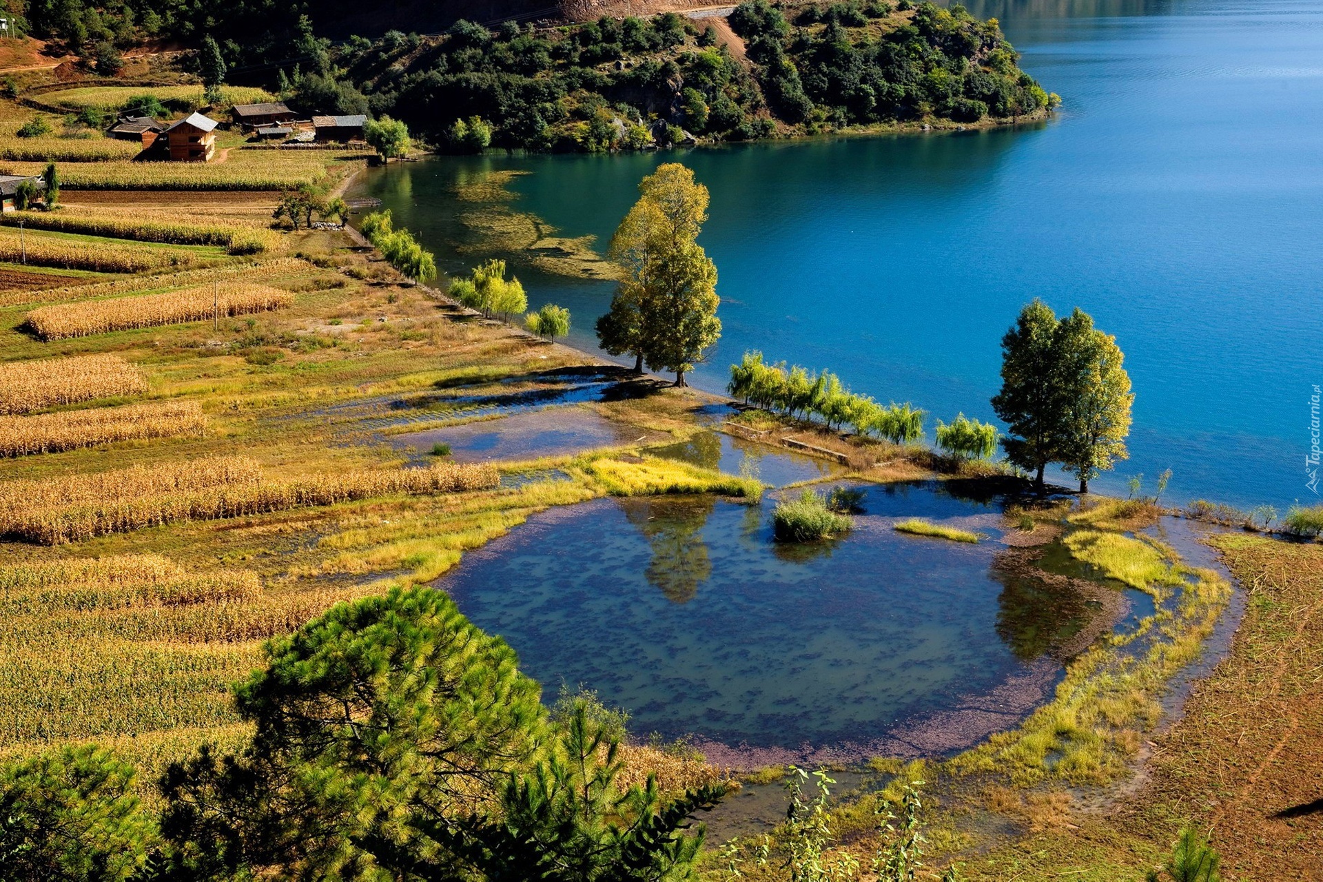 Edytor tapety: Zatoka, Przybrzeżne, Uprawy, Domy, Drzewa