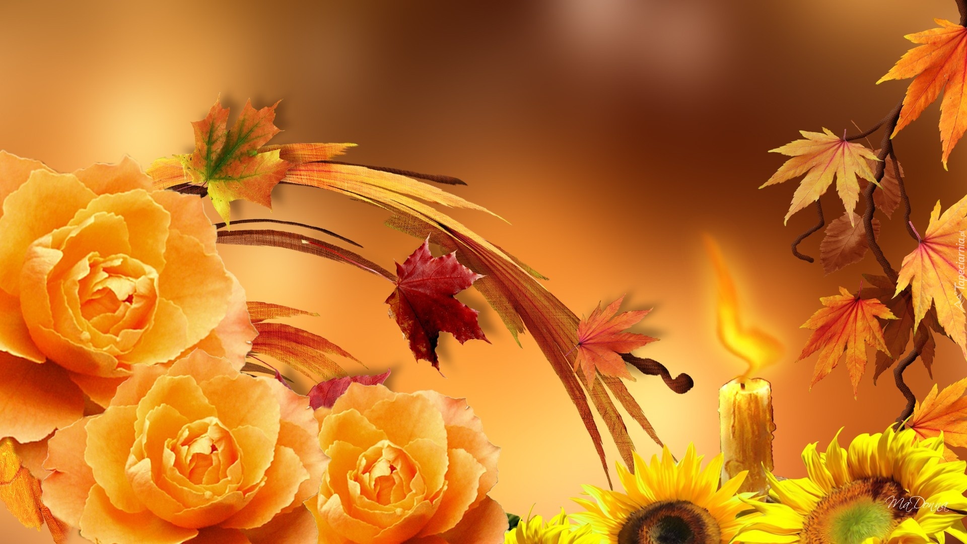 Edytor tapety: Jesień, Róże, Słoneczniki, Liście