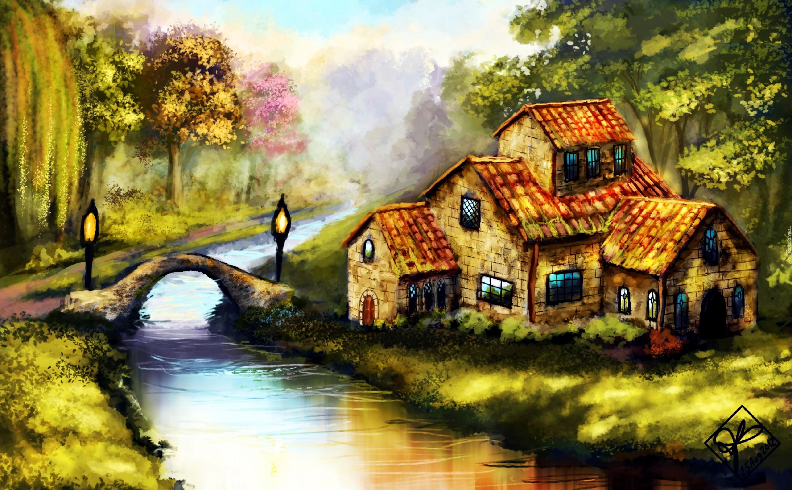 Edytor tapety: Rzeka, Mostek, Dom, Malarstwo