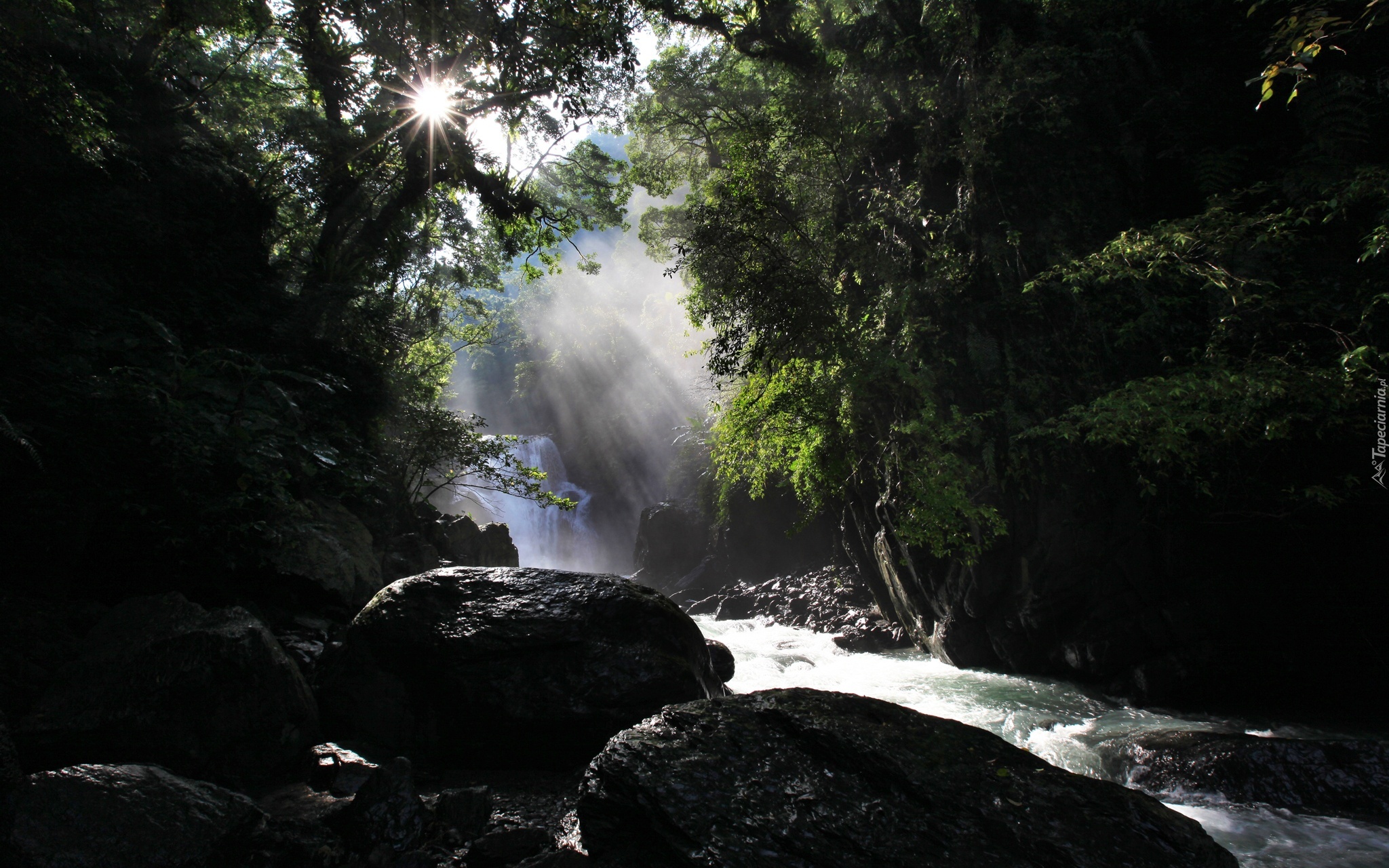 Edytor tapety: Rzeka, Kamienie, Drzewa, Prześwitujące, Słońce