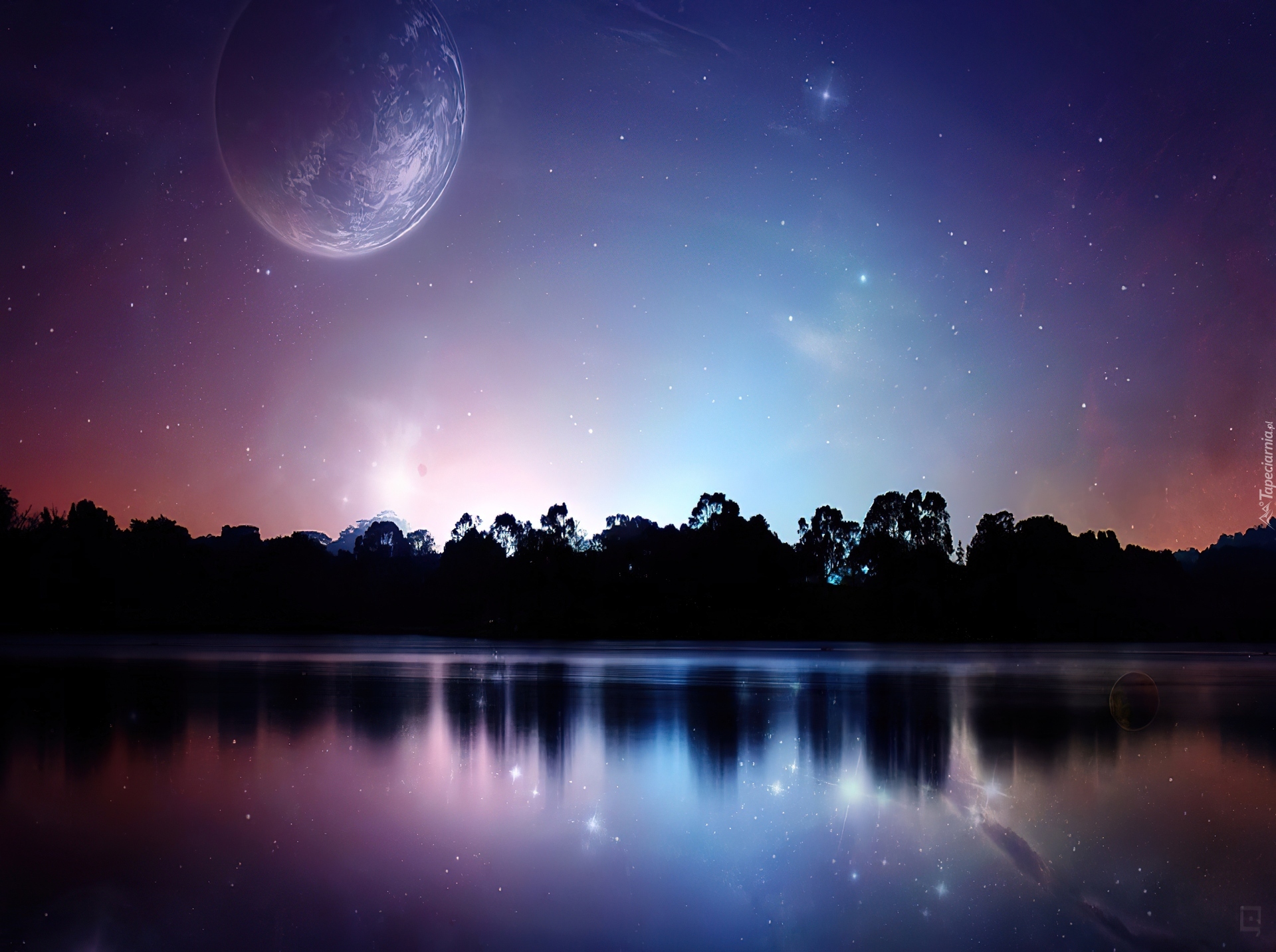 Edytor tapety: Noc, Gwiazdy, Planeta, Jezioro