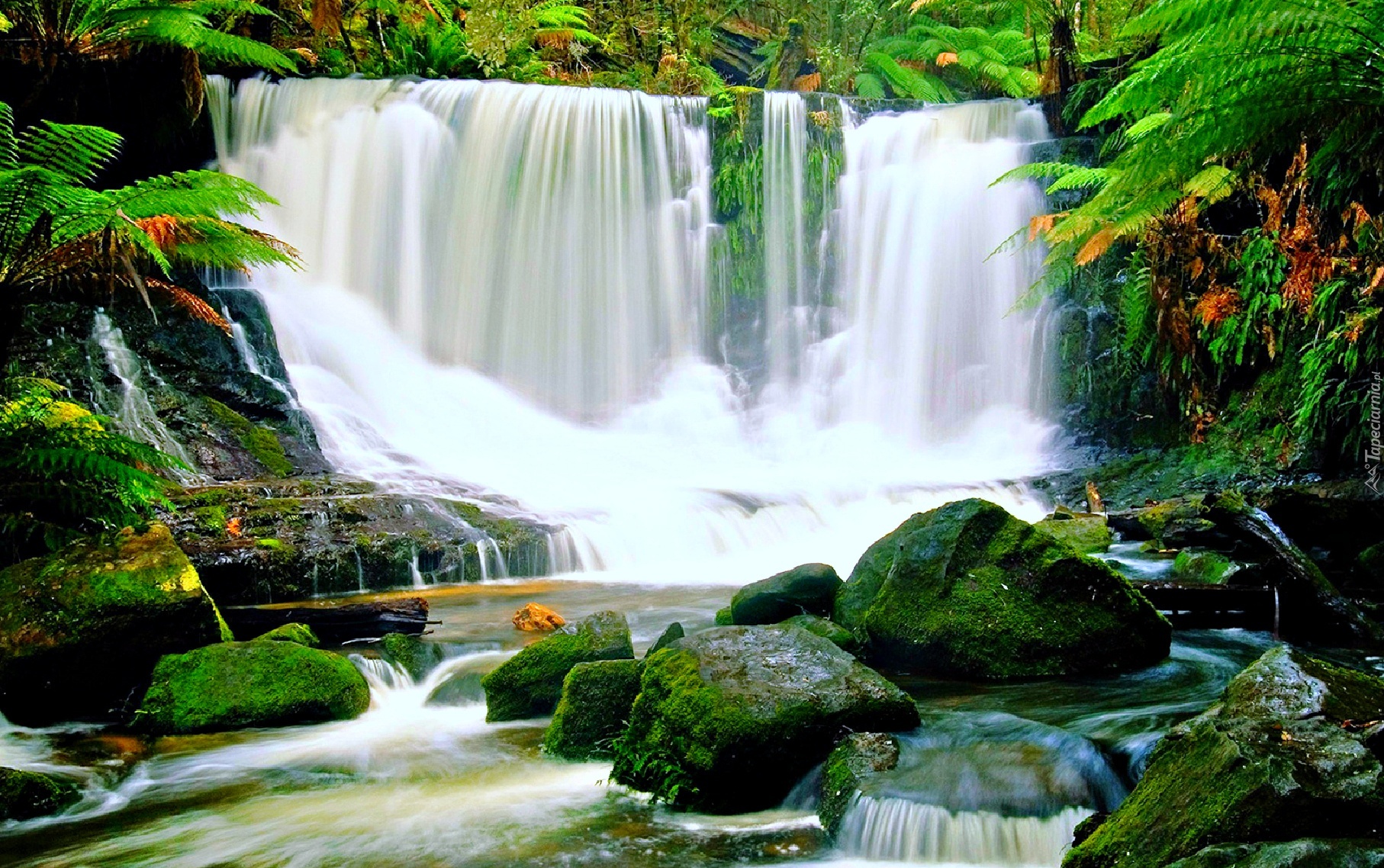 Edytor tapety: Wodospad, Skały, Mchy