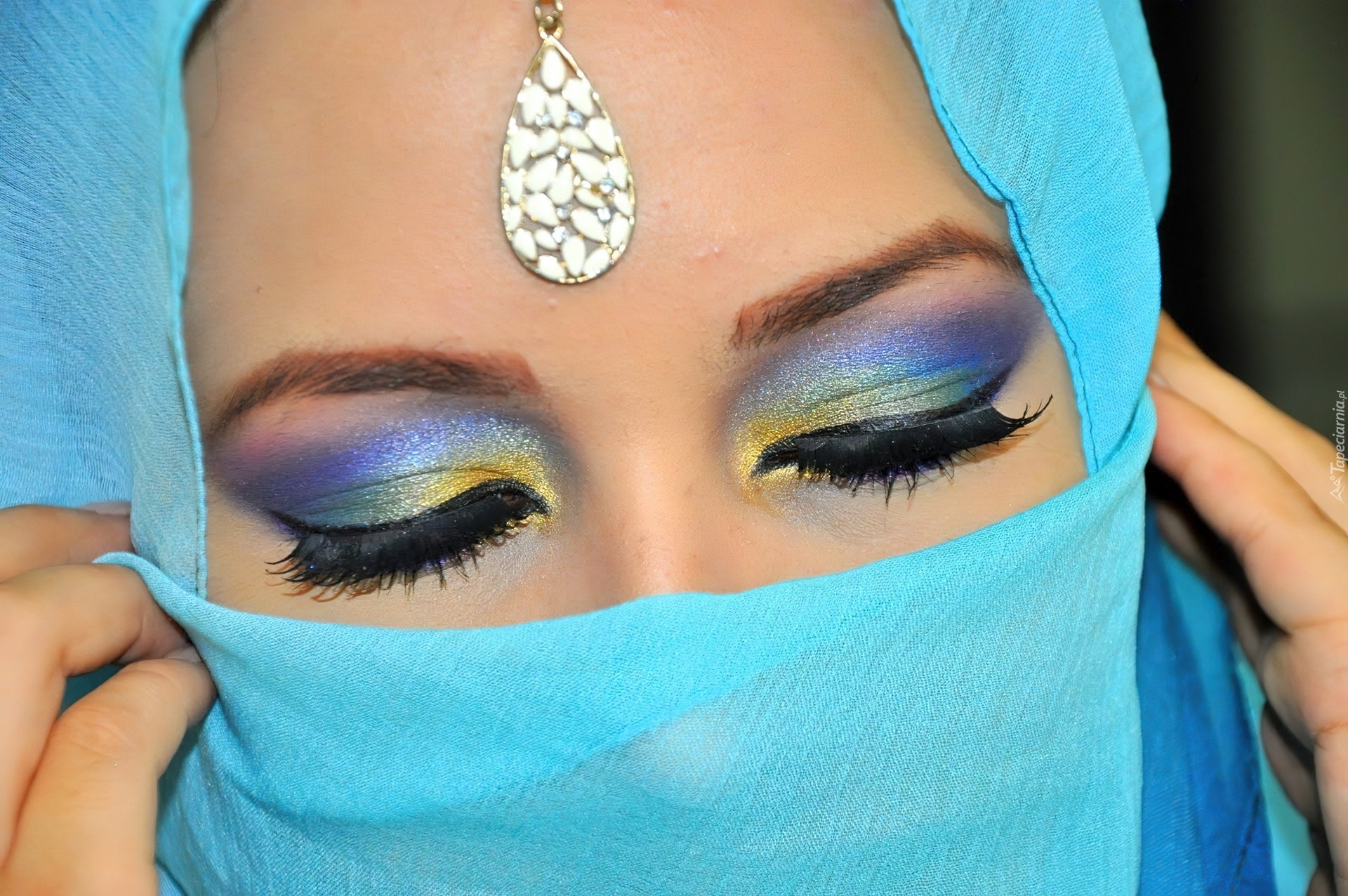 Edytor tapety: Kobieta, Makijaż, Niebieska, Chusta