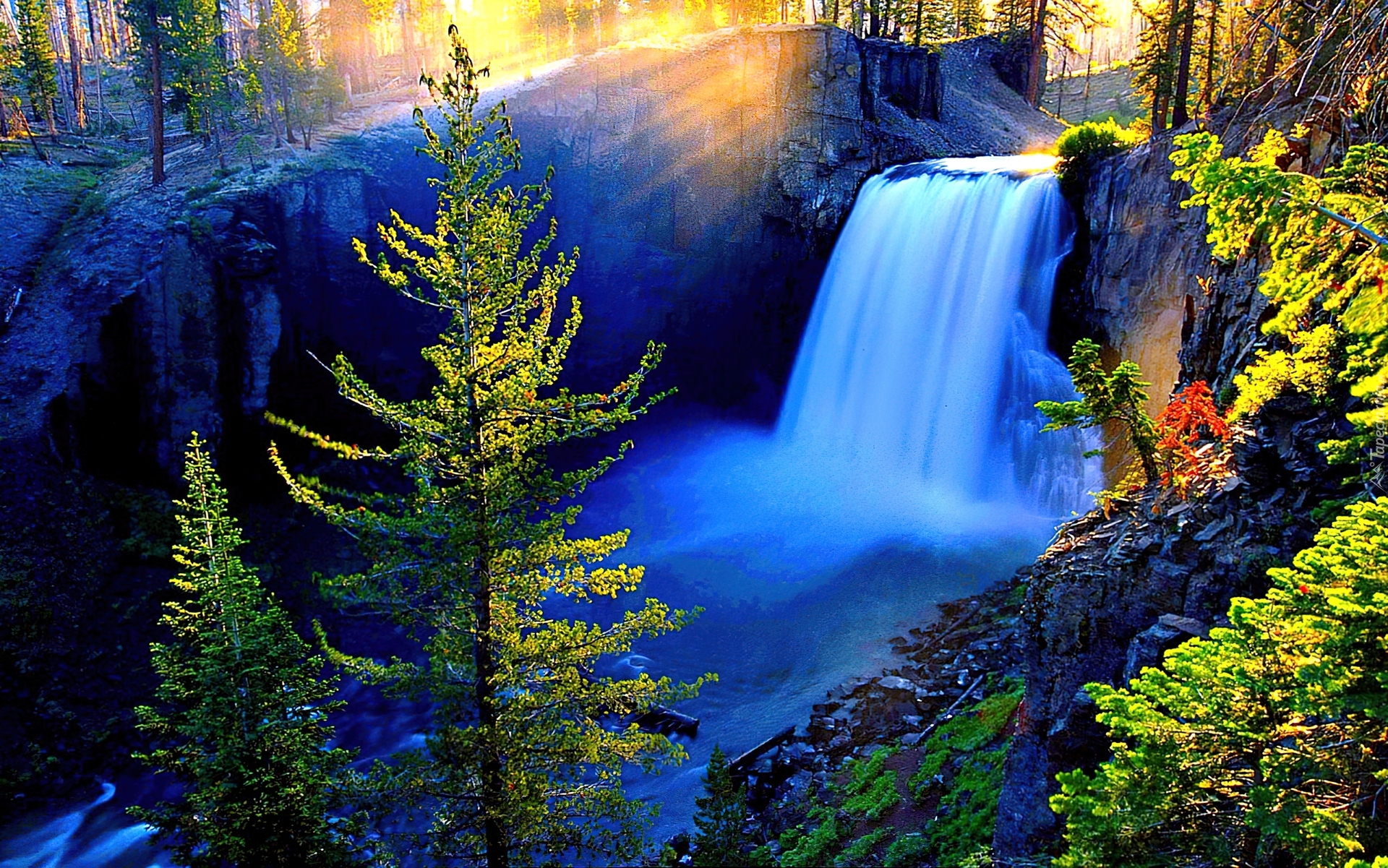 Edytor tapety: Wodospad, Drzewa, Promienie, Słońca
