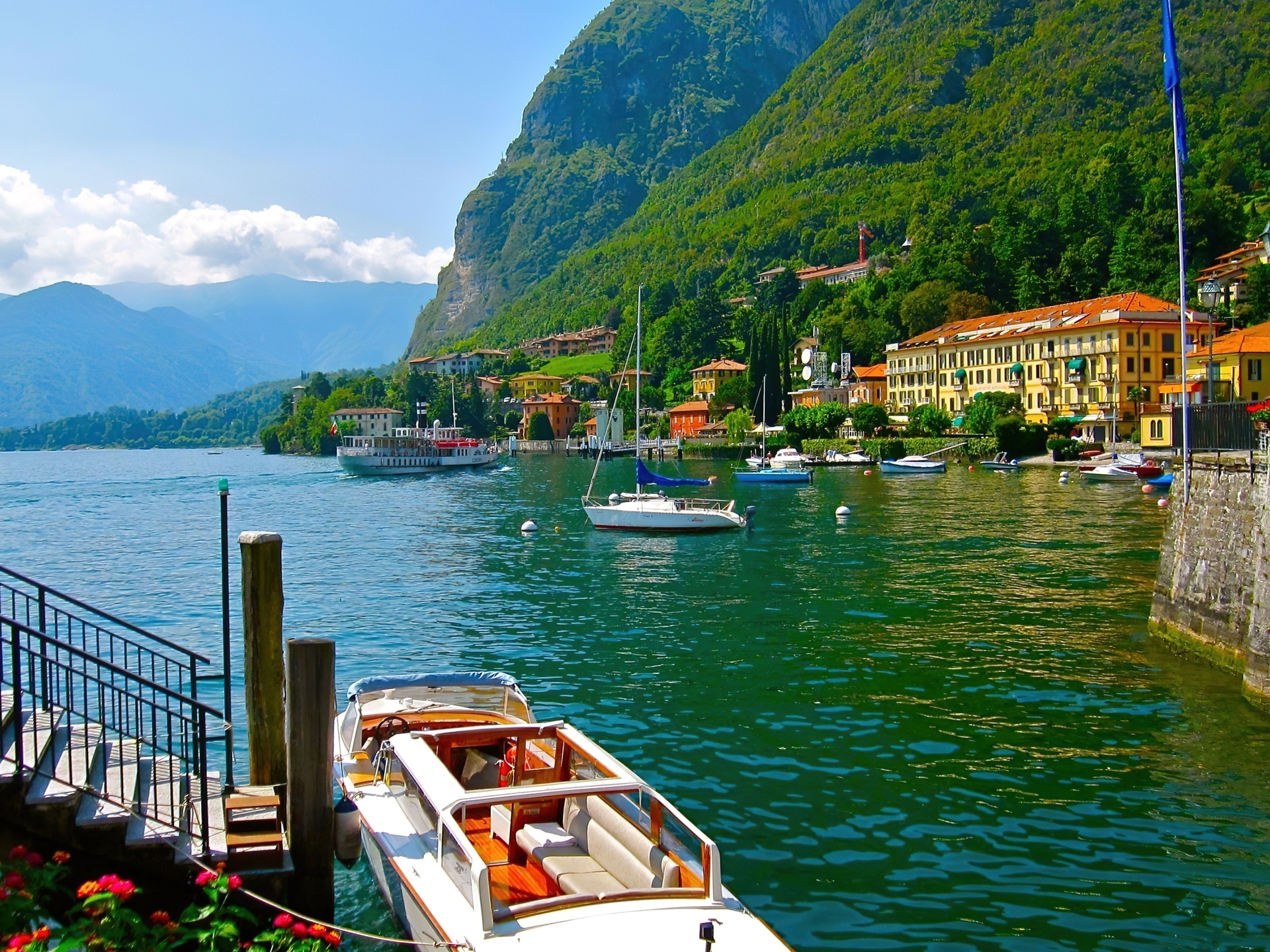 Edytor tapety: Góry, Rzeka, Łódki, Domy