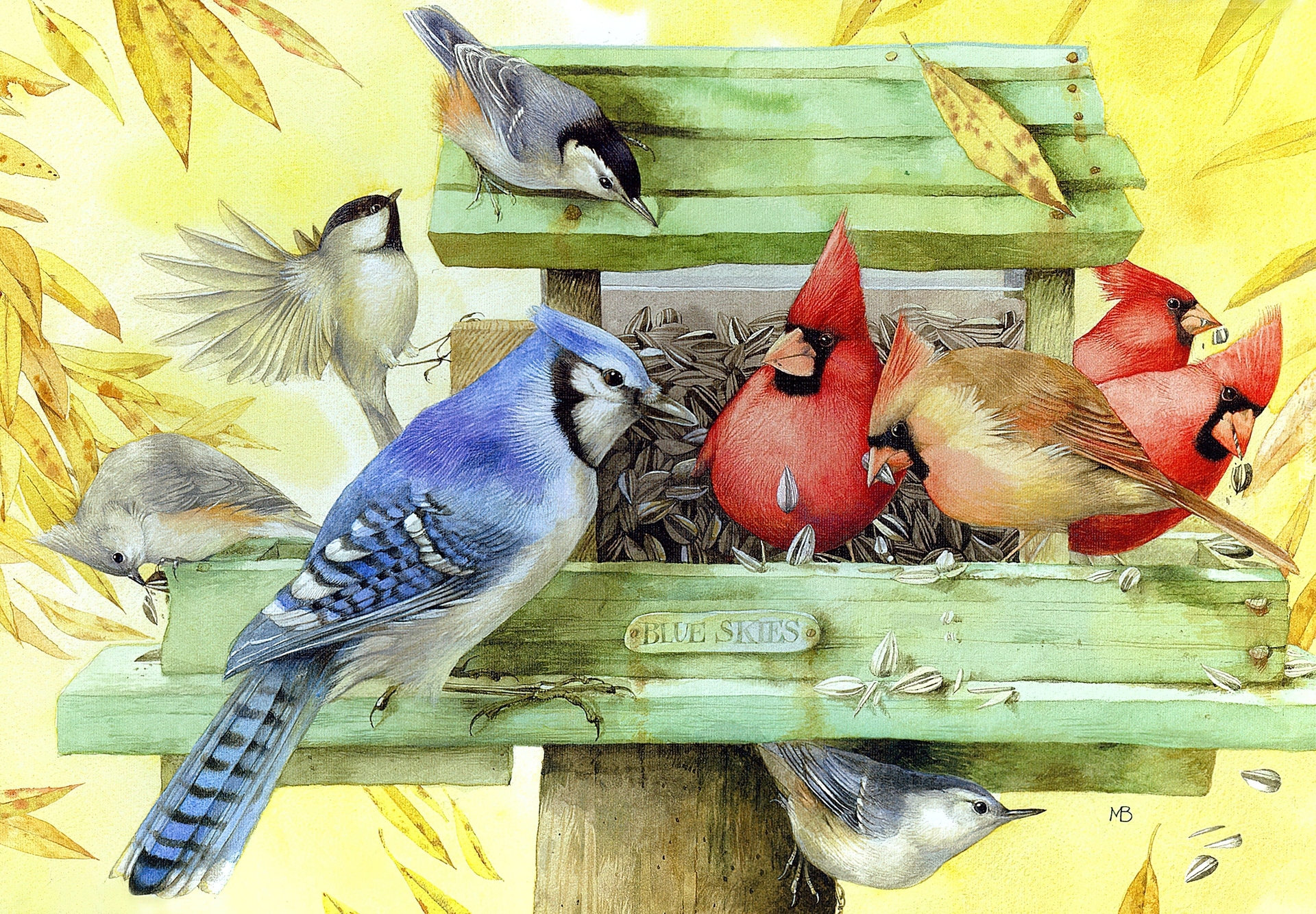 Edytor tapety: Ptaki, Kardynały, Sójka, Sikorki, Zielony, Domek