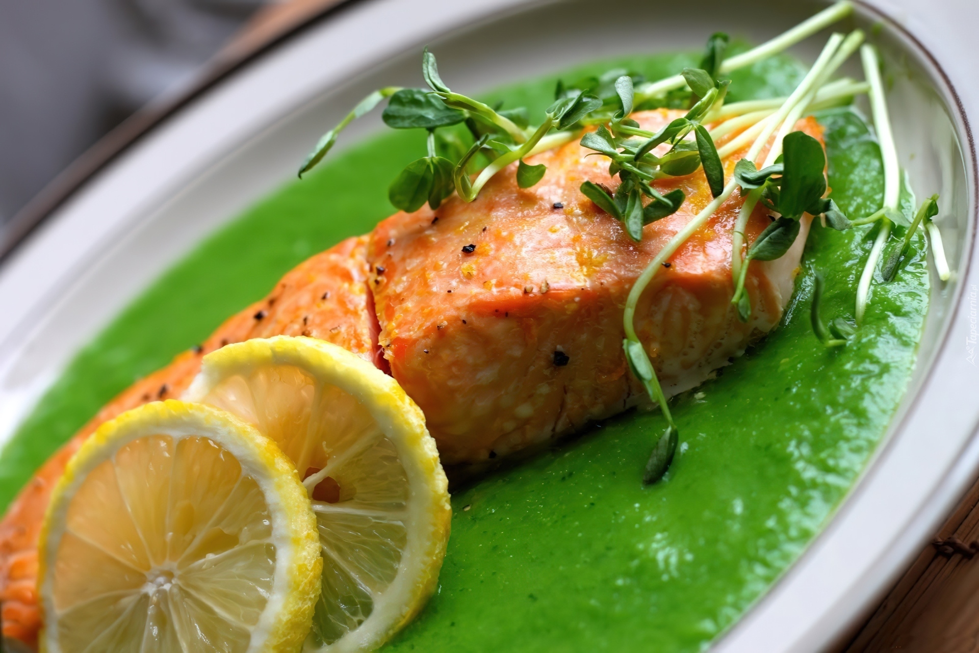 Edytor tapety: Potrawa, Ryba, Łosoś, Zielony, Sos, Cytryna