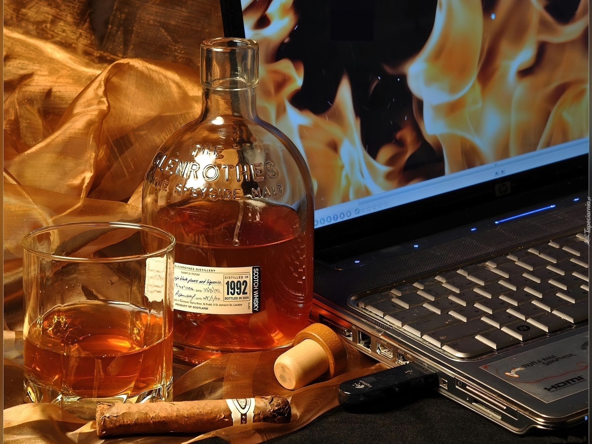 Edytor tapety: Szklaneczka, Butelka, Koniak, Cygaro, Laptop