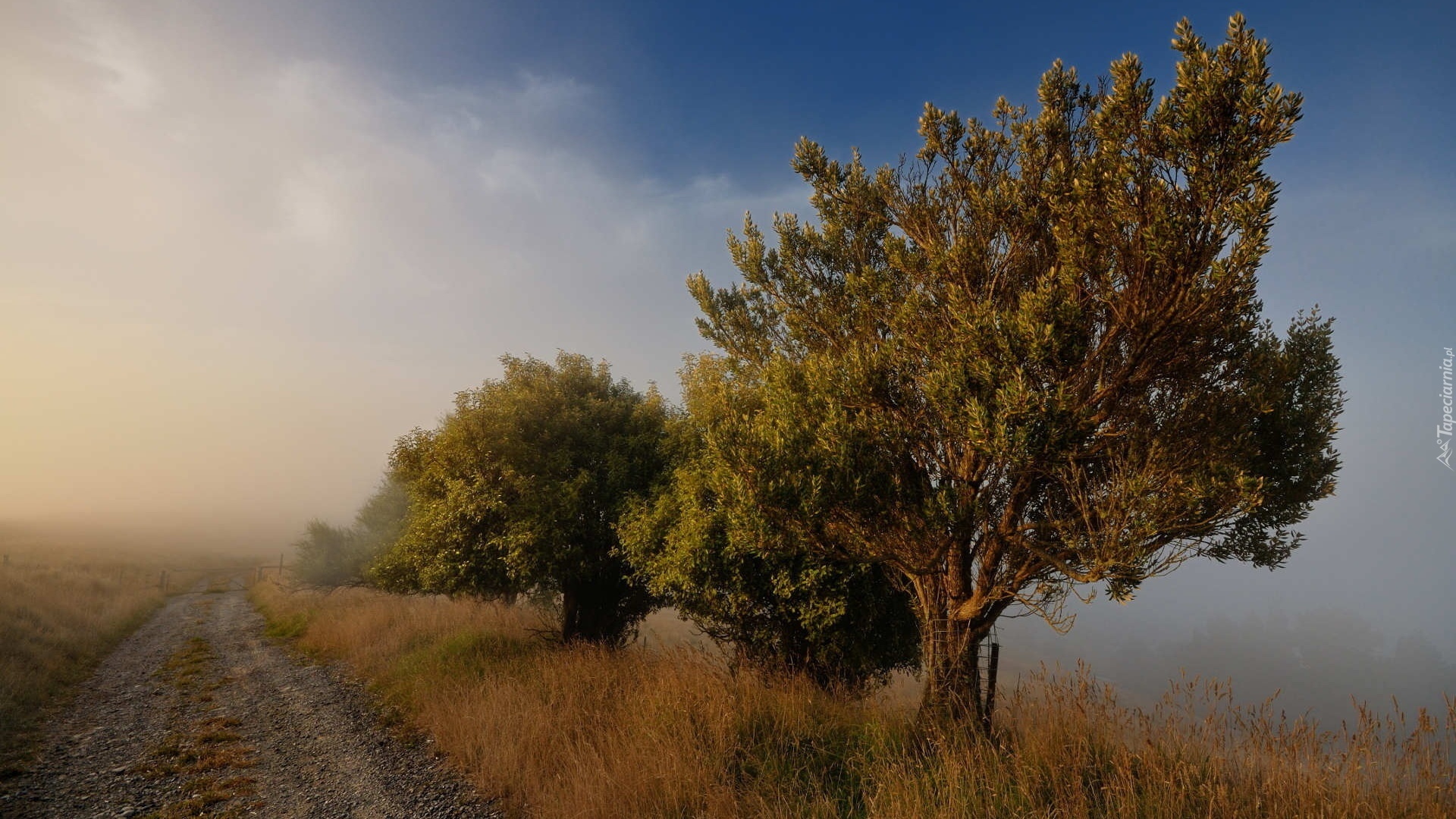 Edytor tapety: Droga, Drzewa, Trawa, Mgła