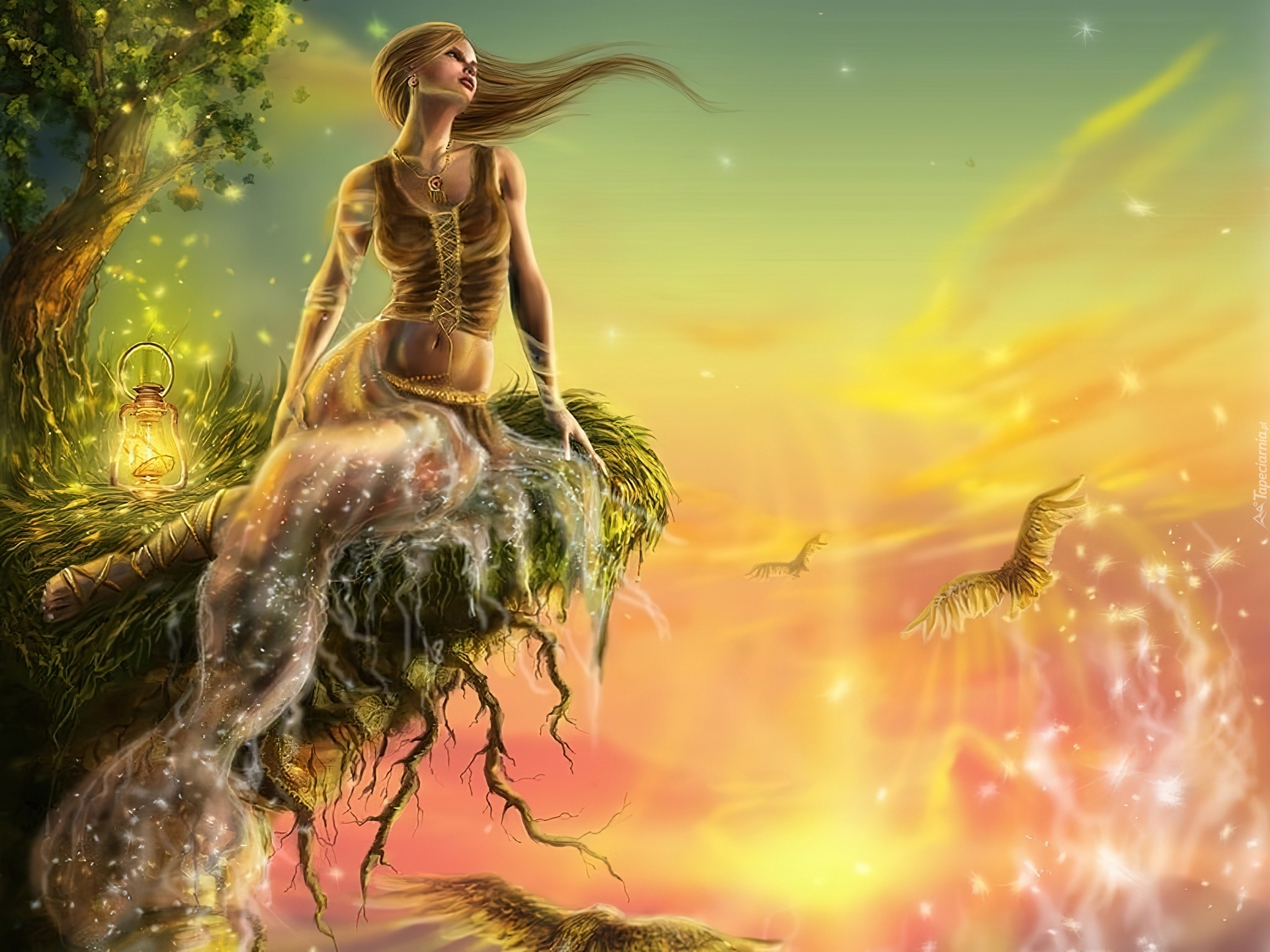 Edytor tapety: Dziewczyna, Lampa, Drzewo, Ptaki