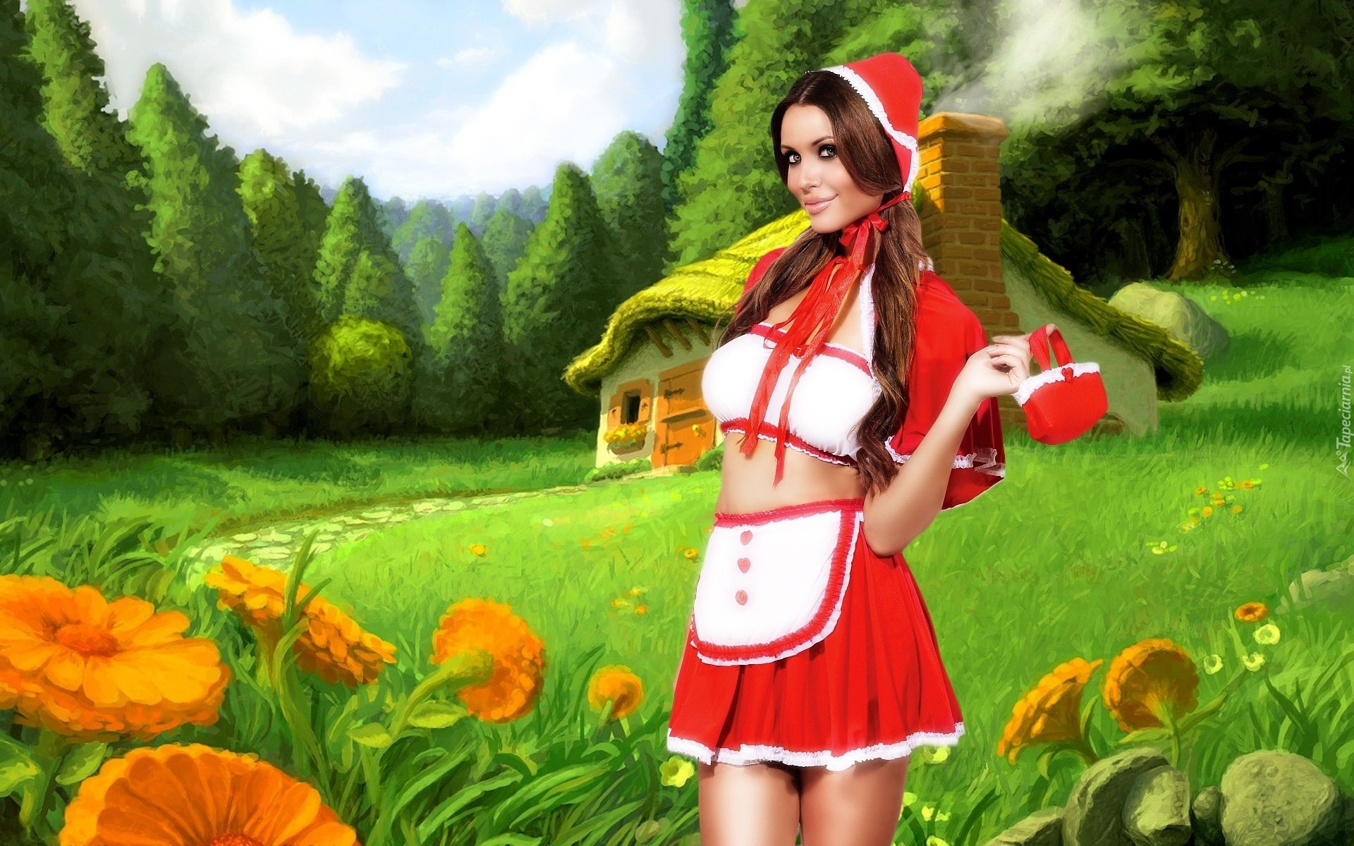 Edytor tapety: Kobieta, Czerwony Kapturek, Cosplay, Chatka, Las, Kwiaty